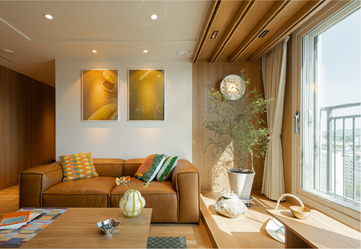 시간대별 자연광을 고려하고 공간별 조명 톤,소재의 질감 등으로 집의 분위기를 조절합니다.