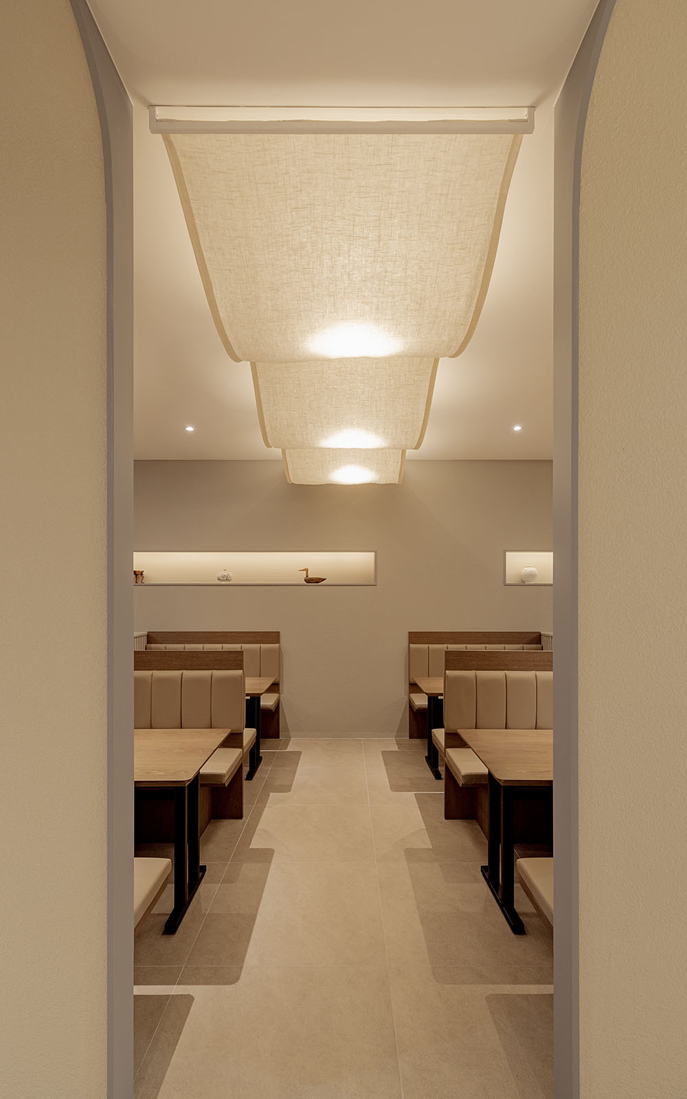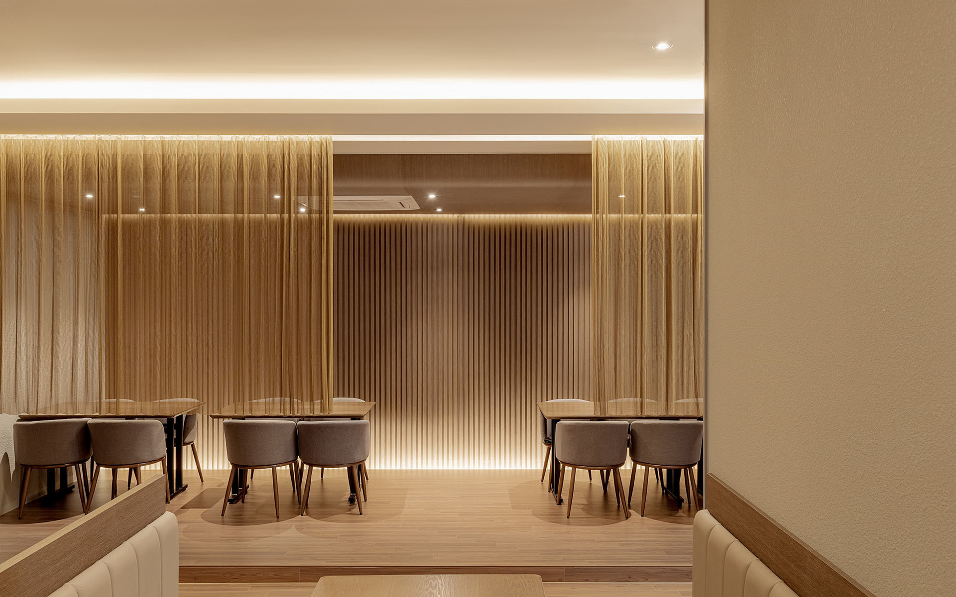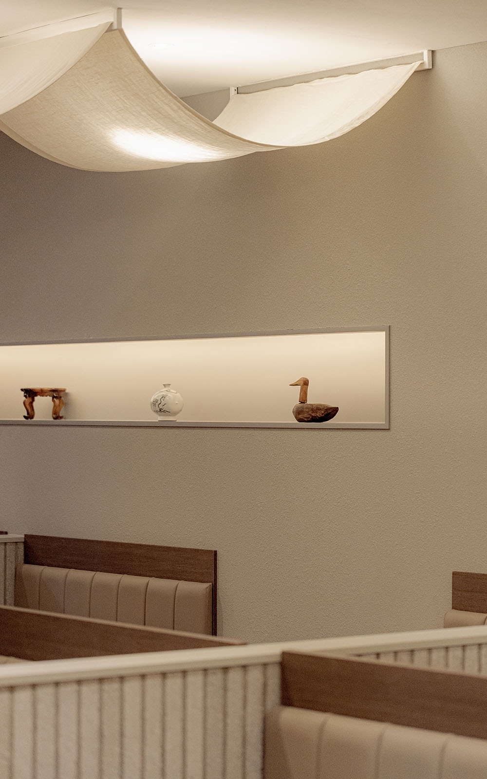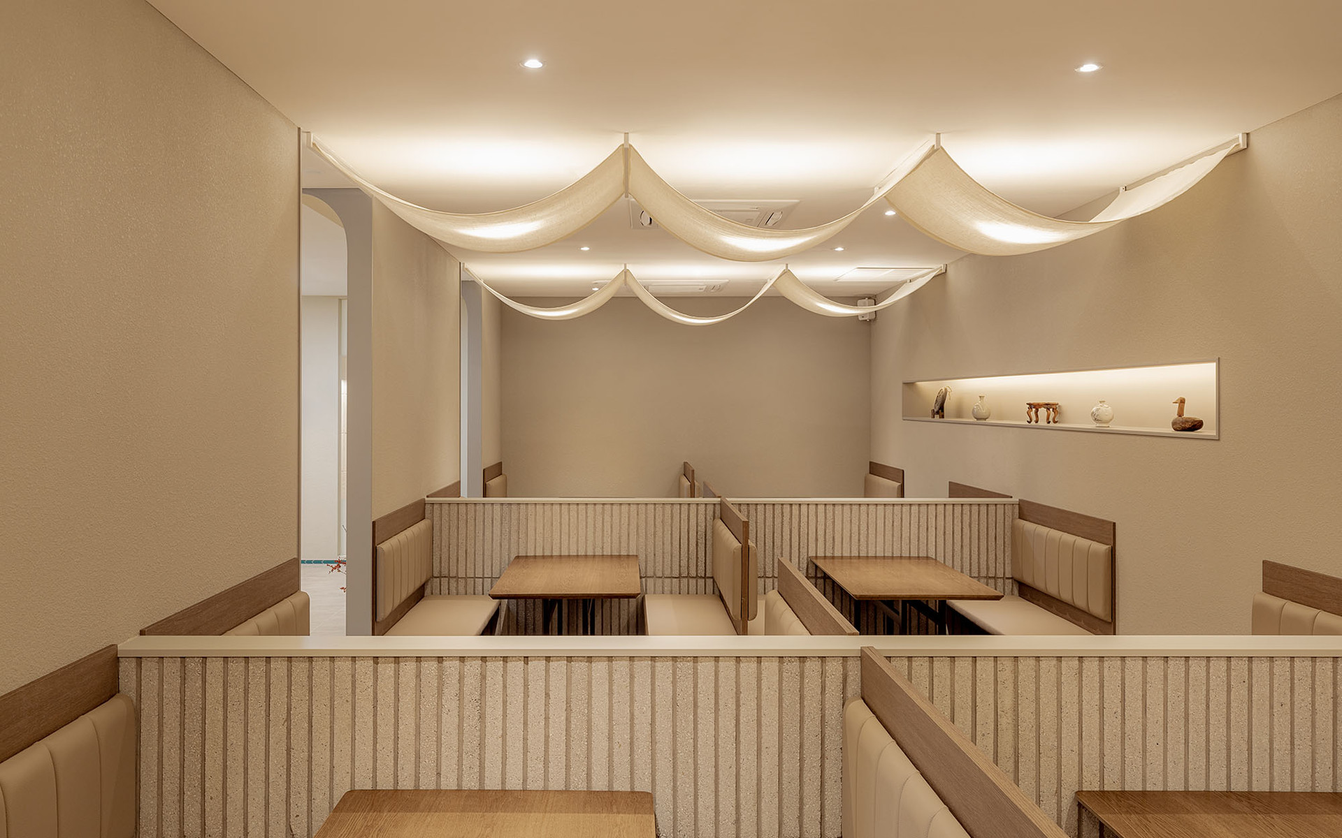 한식의 모든 것을 담은 브랜드, 모담입니다. 브랜딩부터 공간까지 엔도에서 진행한 작업으로 한식의 모든 것을 담는 소반상과 단청을 컨셉으로 진행되었습니다. 곡선의 요소와 긴 타일을 사용하여 단청과 서까래 형태를 부여해 한국적이지만 전체적인 모던함으로 도심과 잘 어우러지게 설계된 공간입니다.