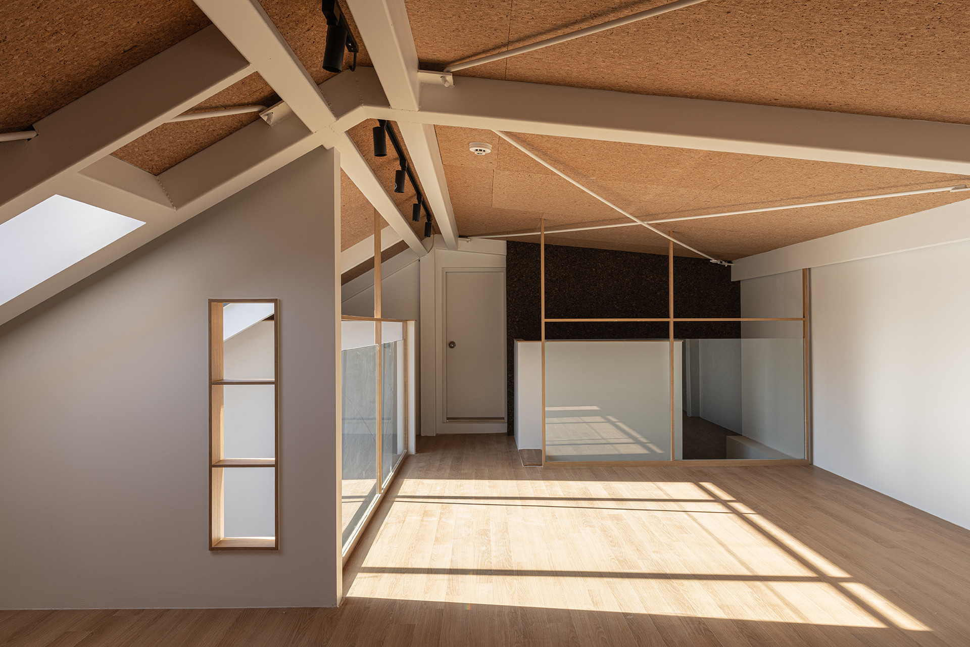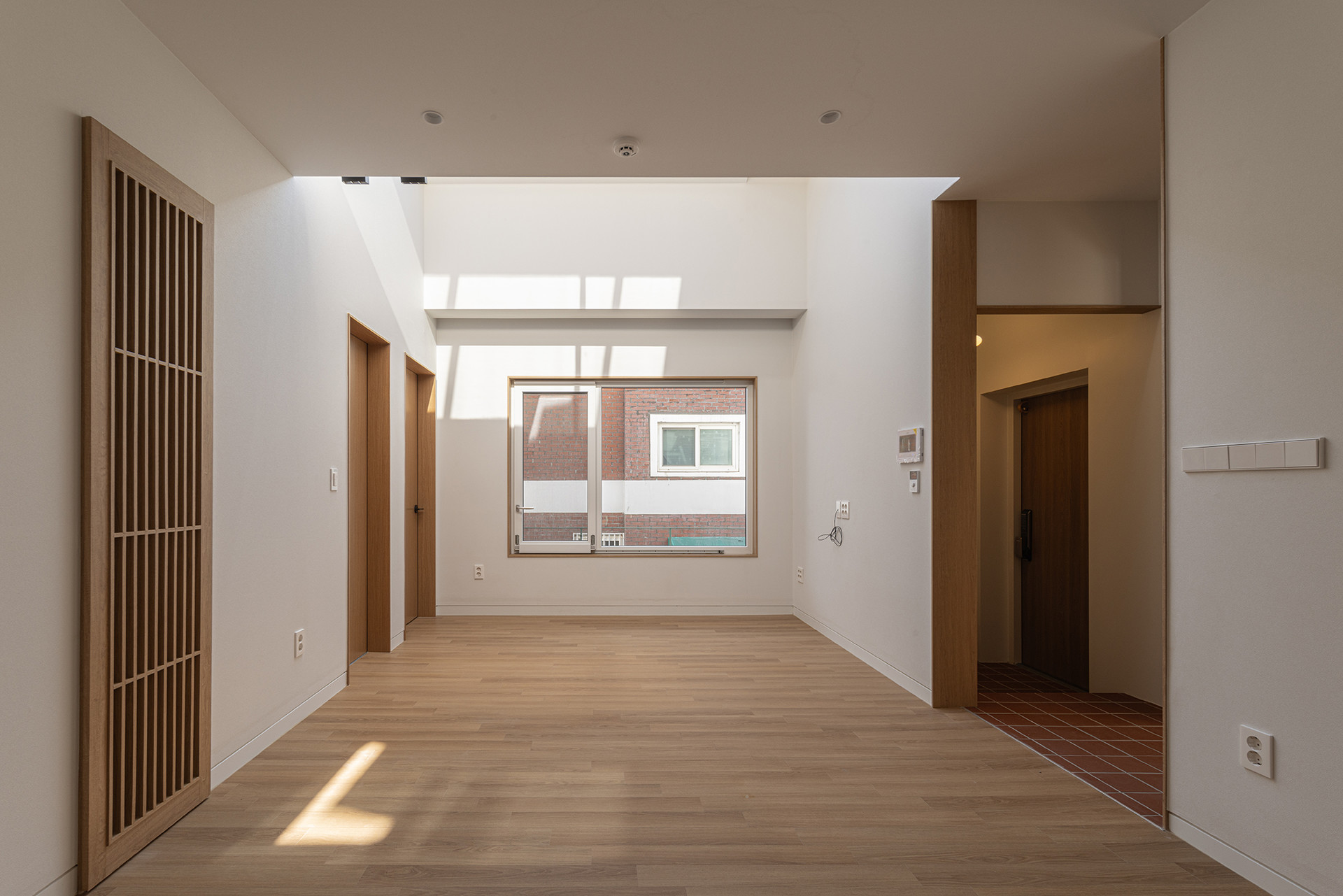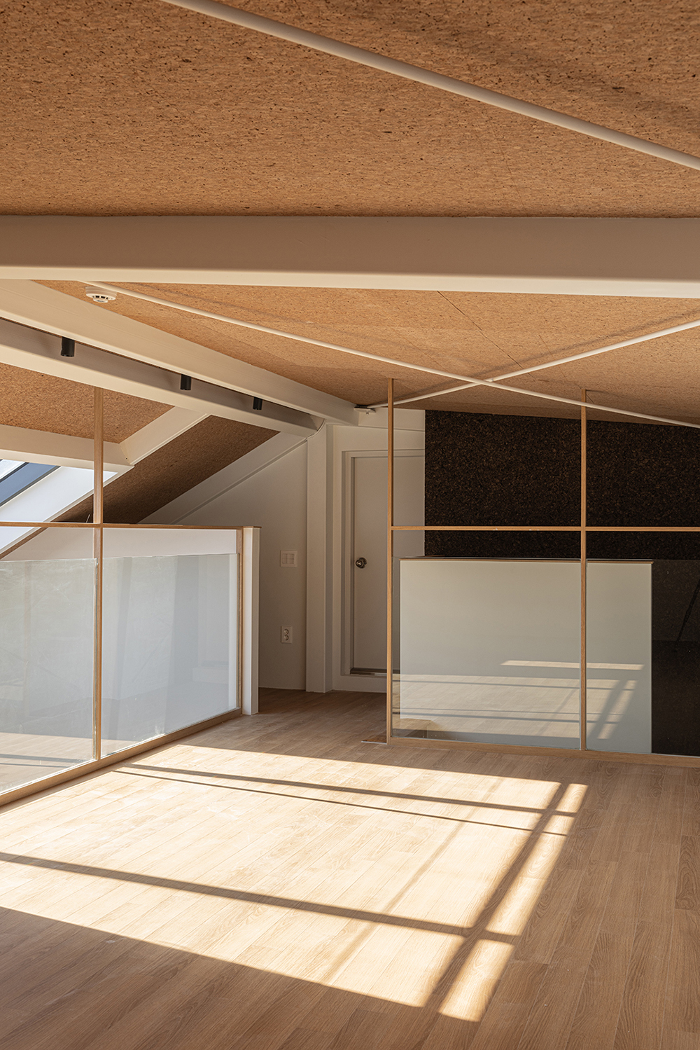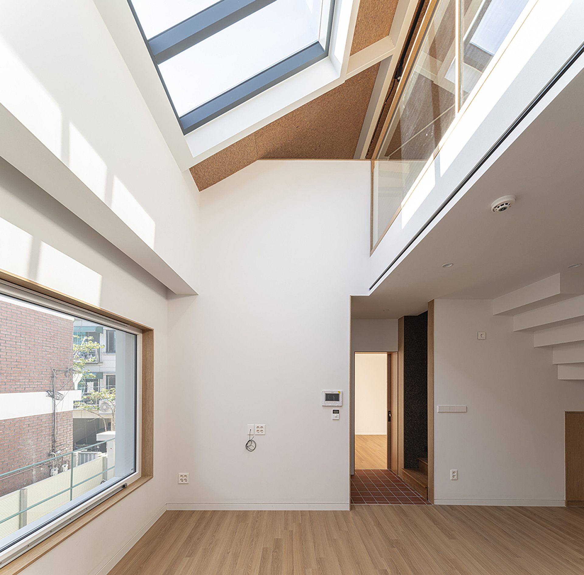 애초에 이 프로젝트는 건축주분께서 거주가 아닌 전세를 위한 집으로 계획되어 수수하게 지어질 예정이었습니다. 그러나 기존 건축물을 철거하는 과정에서 살며시, 오묘하게 스며드는 빛과 이를 품듯 적당히 개방된 층고가 인상 깊어 급히 디자인을 수정하였습니다. 천창을 통해 거실에서 사계절의 변화를 느끼는 경험과, 굽은 계단을 지나 박공 형태로 코르크 마감된 옥탑은 이곳의 인연이 될 어느 가족의 안온한 삶을 바라며, 또 누군가의 유년 시절 추억으로 남기를 바라는 마음으로 지어졌습니다.