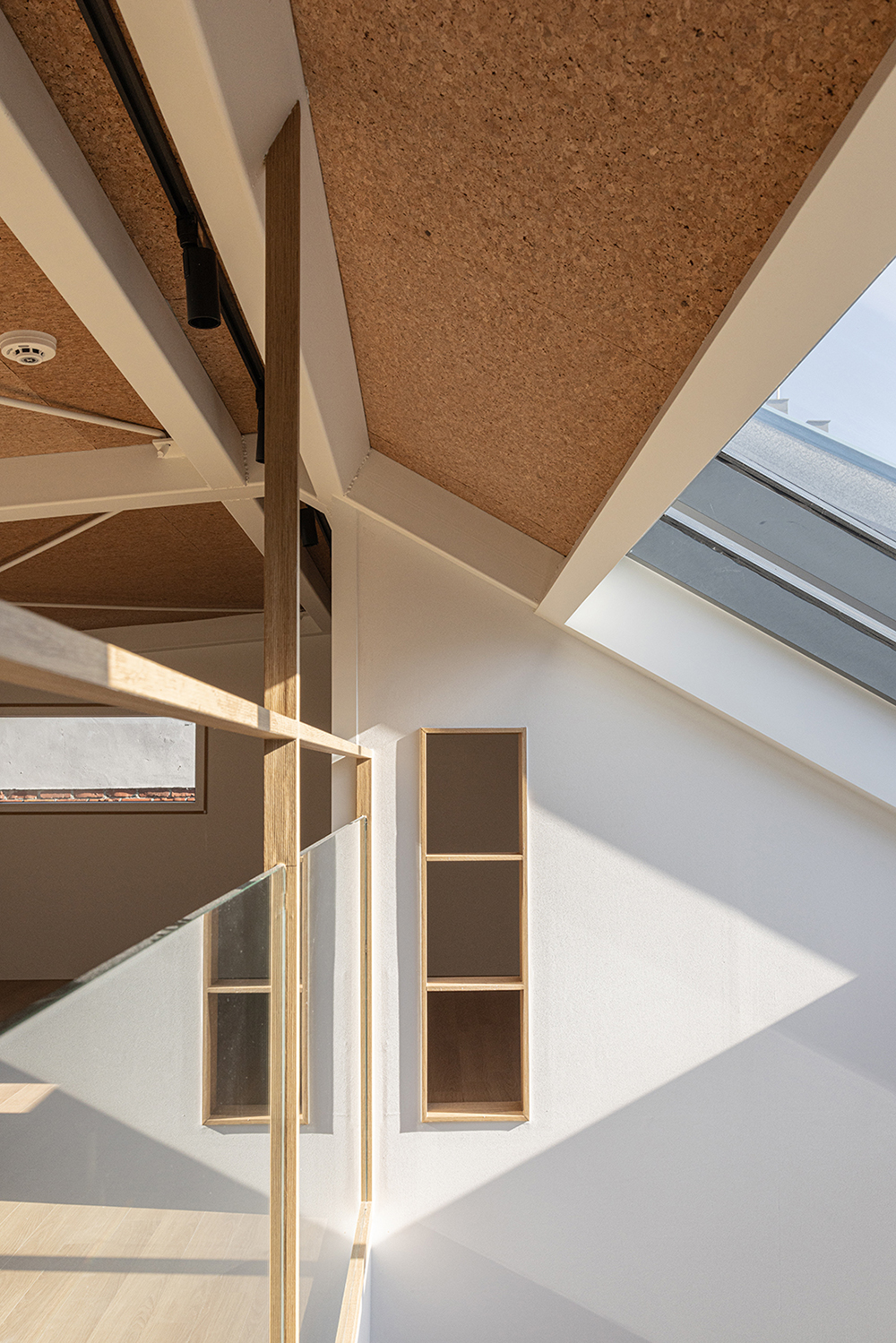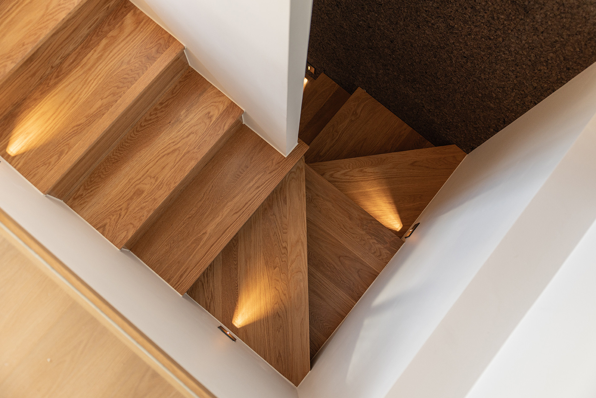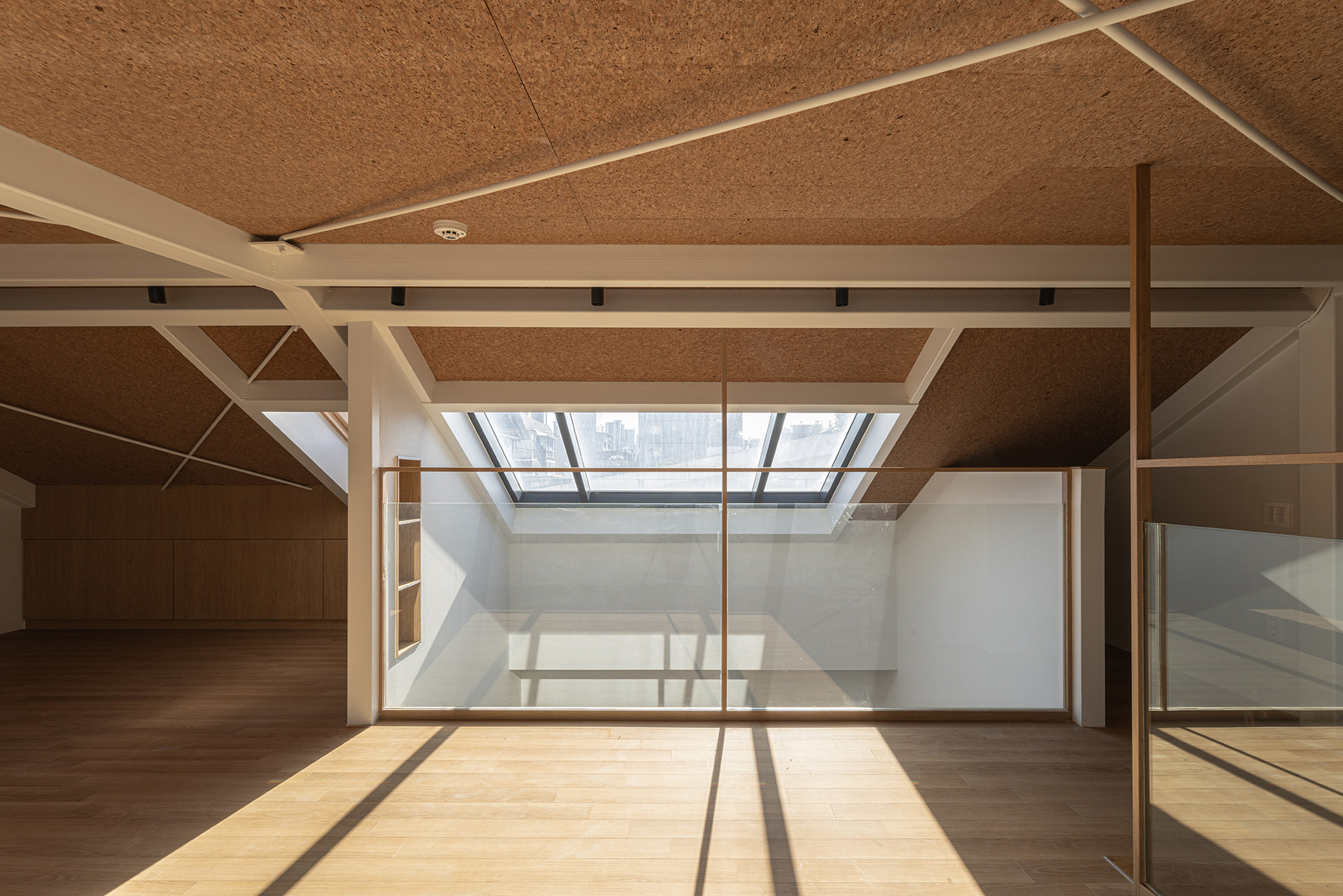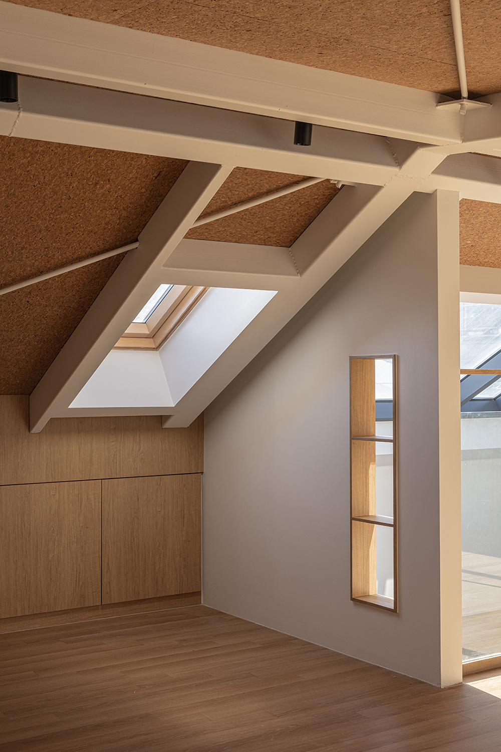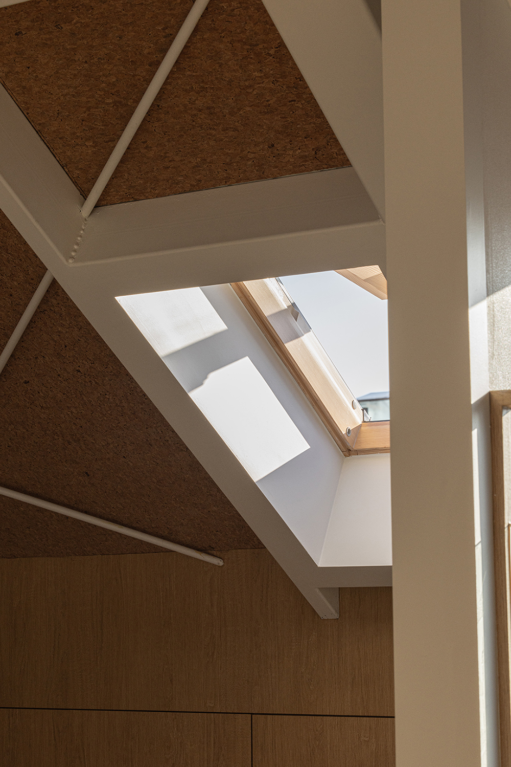 애초에 이 프로젝트는 건축주분께서 거주가 아닌 전세를 위한 집으로 계획되어 수수하게 지어질 예정이었습니다. 그러나 기존 건축물을 철거하는 과정에서 살며시, 오묘하게 스며드는 빛과 이를 품듯 적당히 개방된 층고가 인상 깊어 급히 디자인을 수정하였습니다. 천창을 통해 거실에서 사계절의 변화를 느끼는 경험과, 굽은 계단을 지나 박공 형태로 코르크 마감된 옥탑은 이곳의 인연이 될 어느 가족의 안온한 삶을 바라며, 또 누군가의 유년 시절 추억으로 남기를 바라는 마음으로 지어졌습니다.