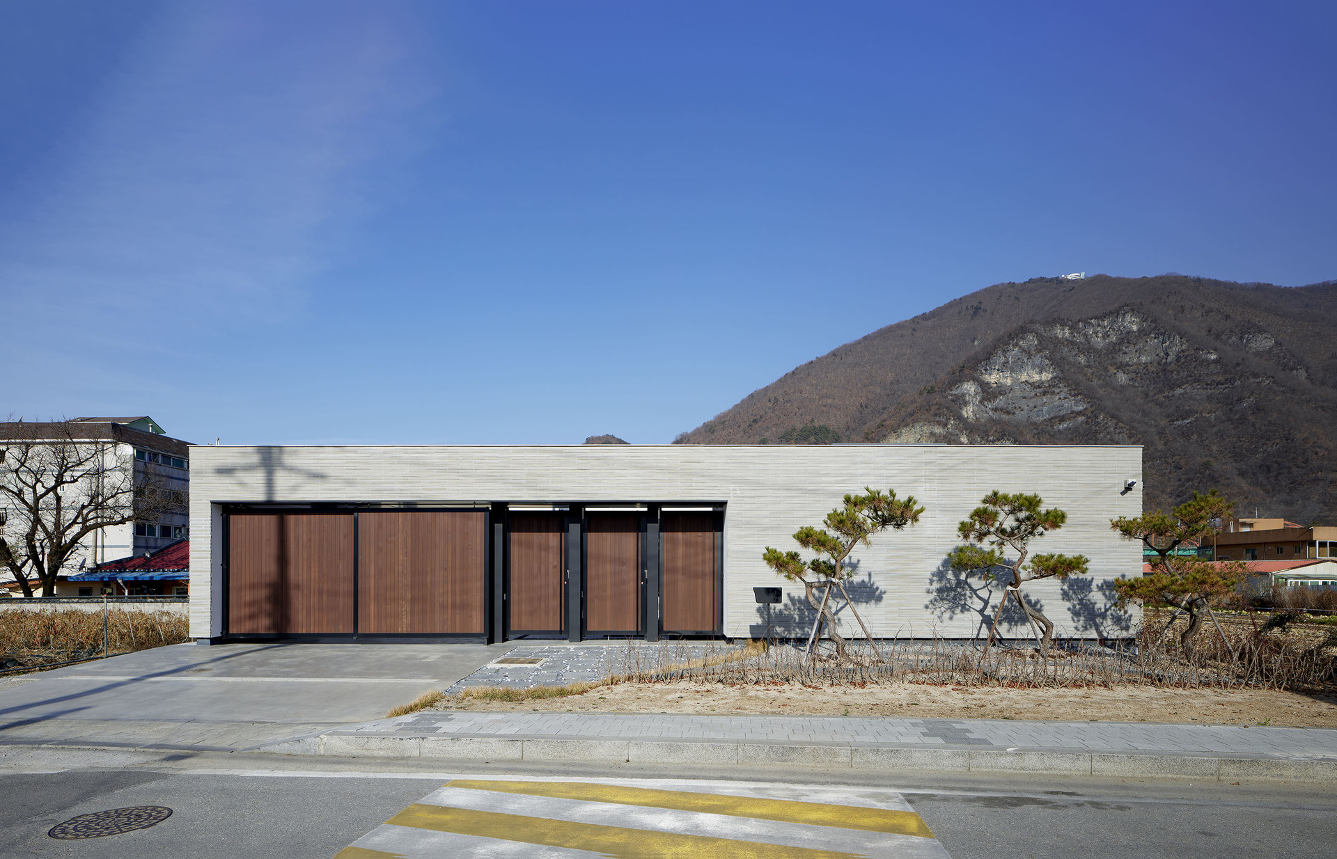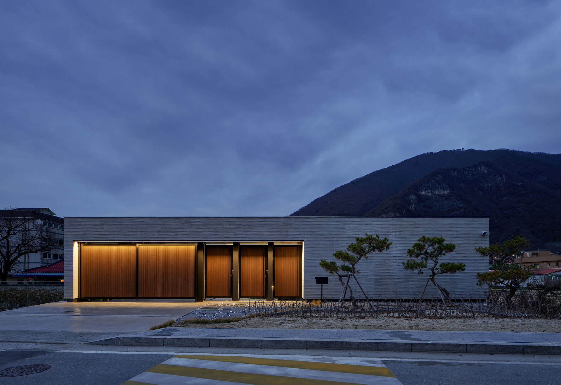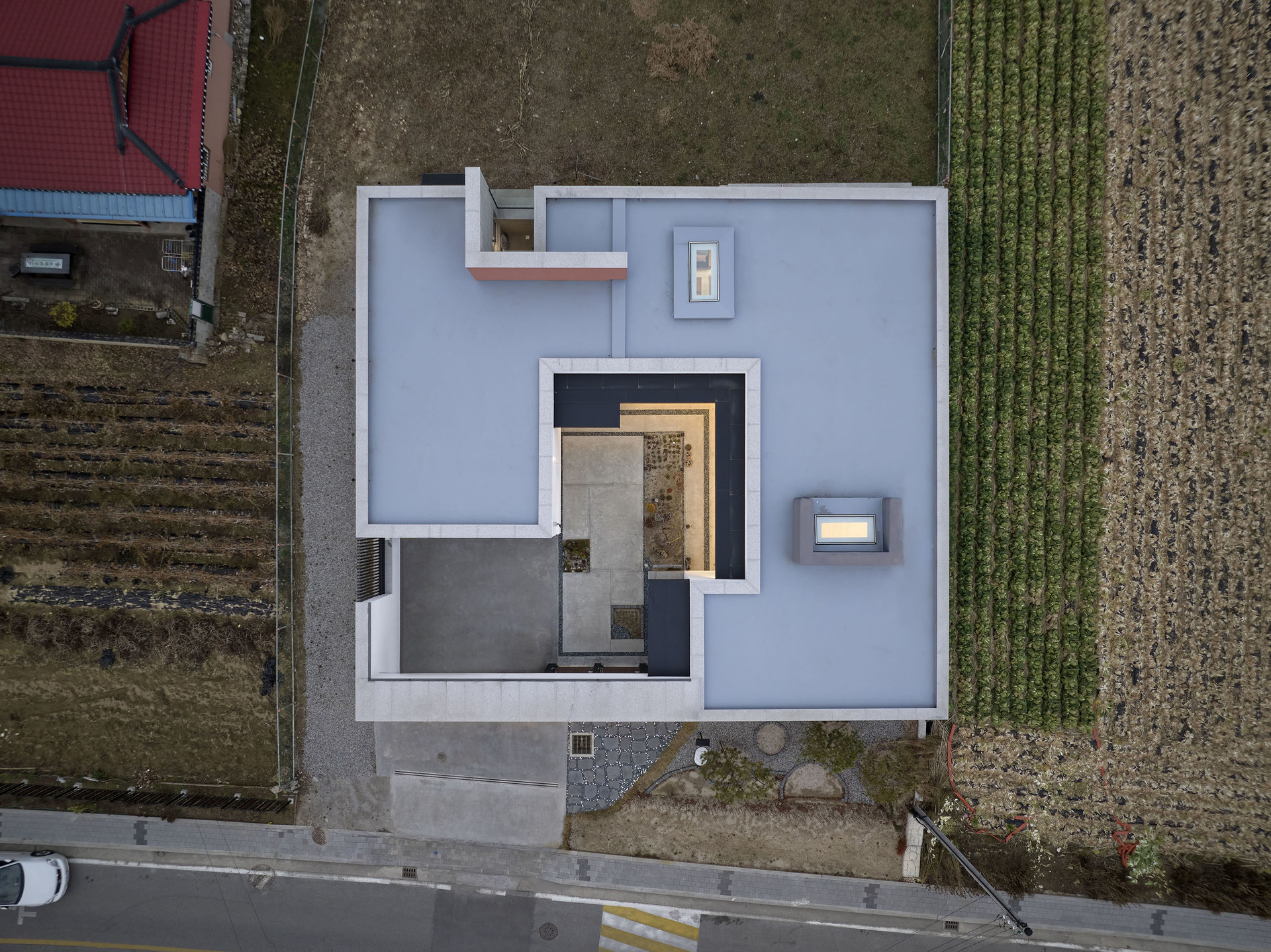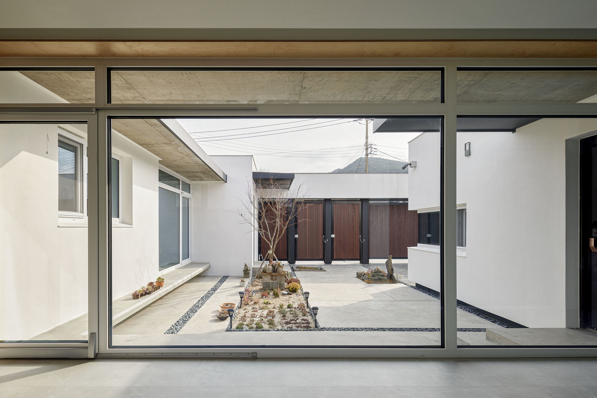 귀촌을 꿈꿨던 아들과 부모님이 함께 사는 강원도 영월의 단독주택입니다. 사방이 열린 대지 속에 담장과 높은 대문을 두어 외부로부터 가족들의 프라이버시를 보호하고, 아들과 부모님 두 개로 분리된 공간은 마당을 통해 연결되는 네모난 구조입니다. 외부로 열려 있지 않지만, 집 안의 마당과 각 거실의 천창은 하늘을 집 안으로 들여 개방감을 주고, 햇살과 자연이 집 안으로 충분히 들어올 수 있도록 설계했습니다.