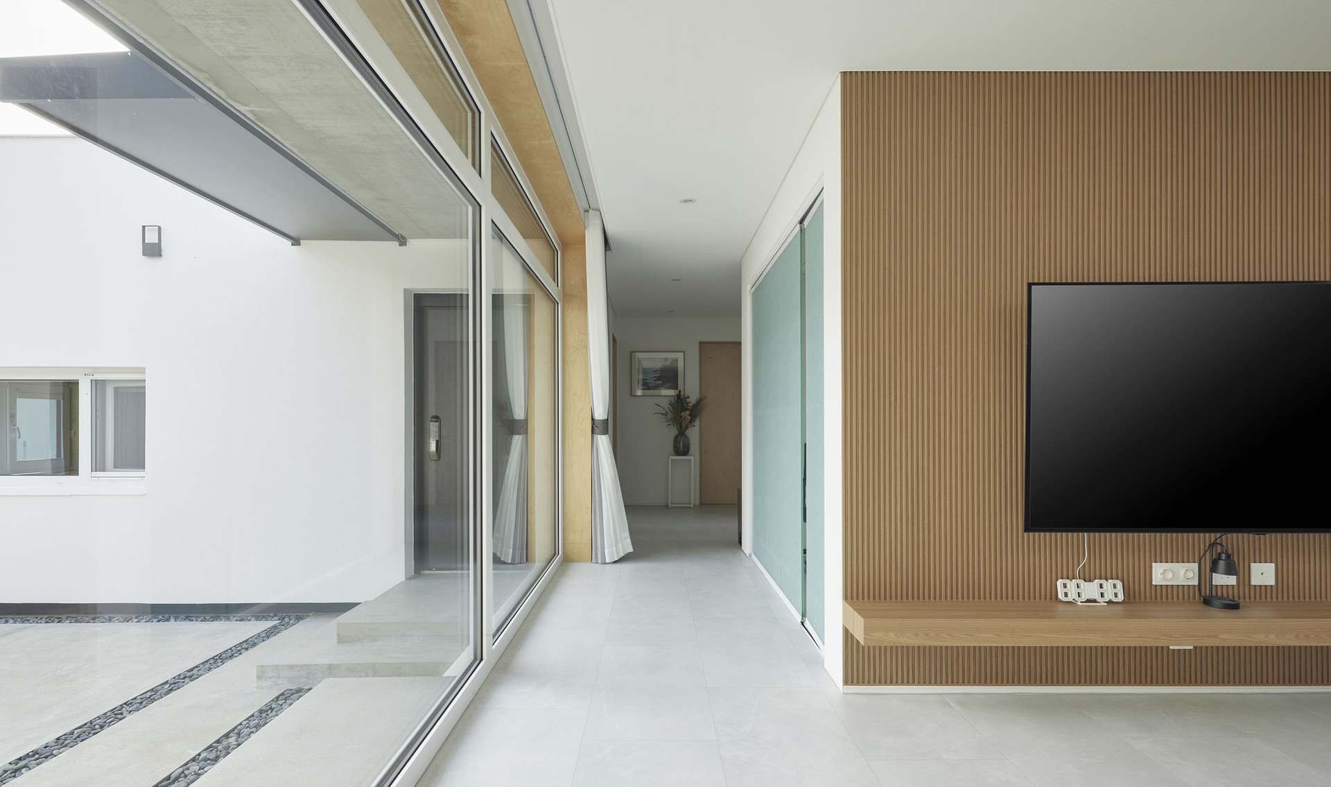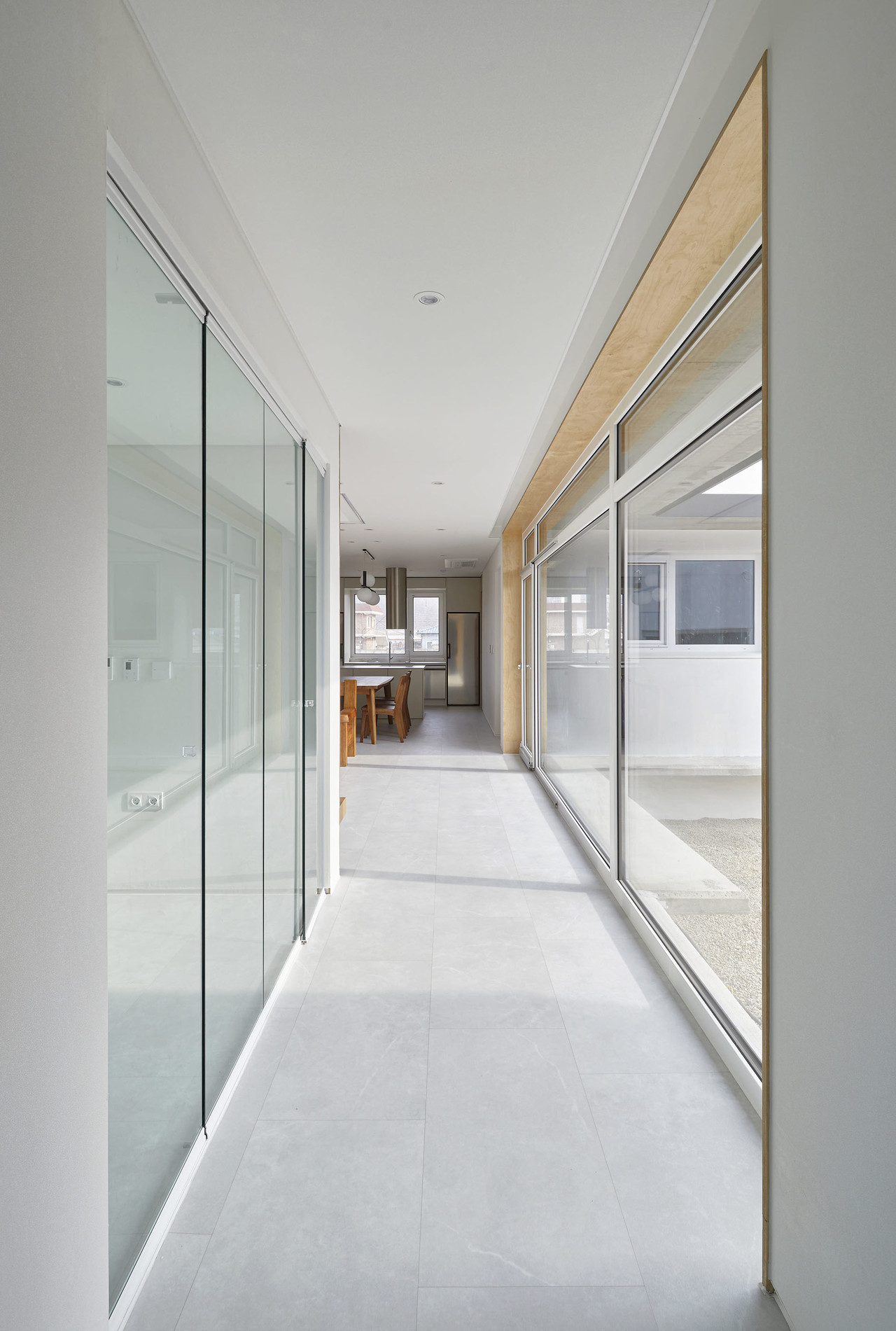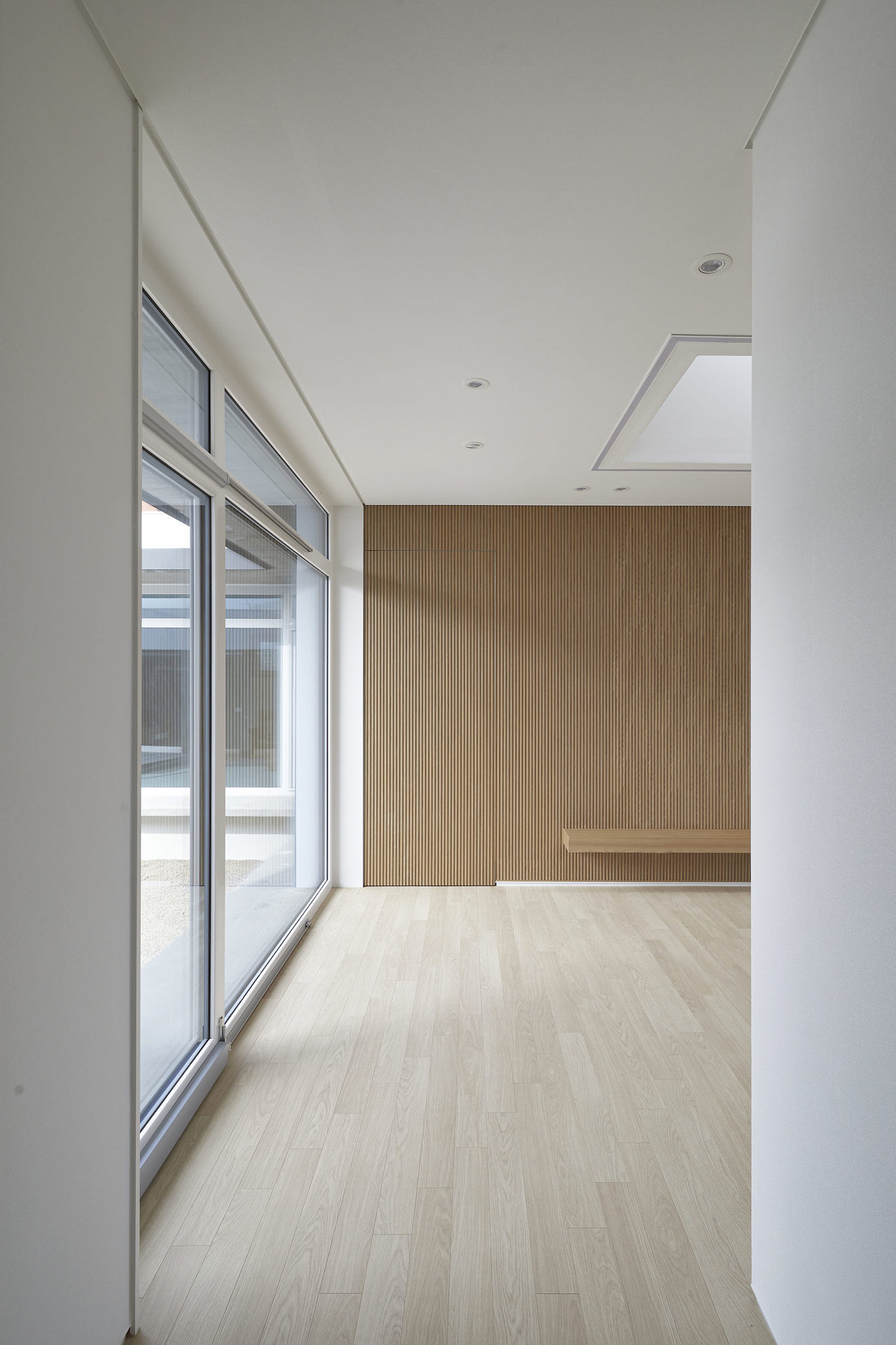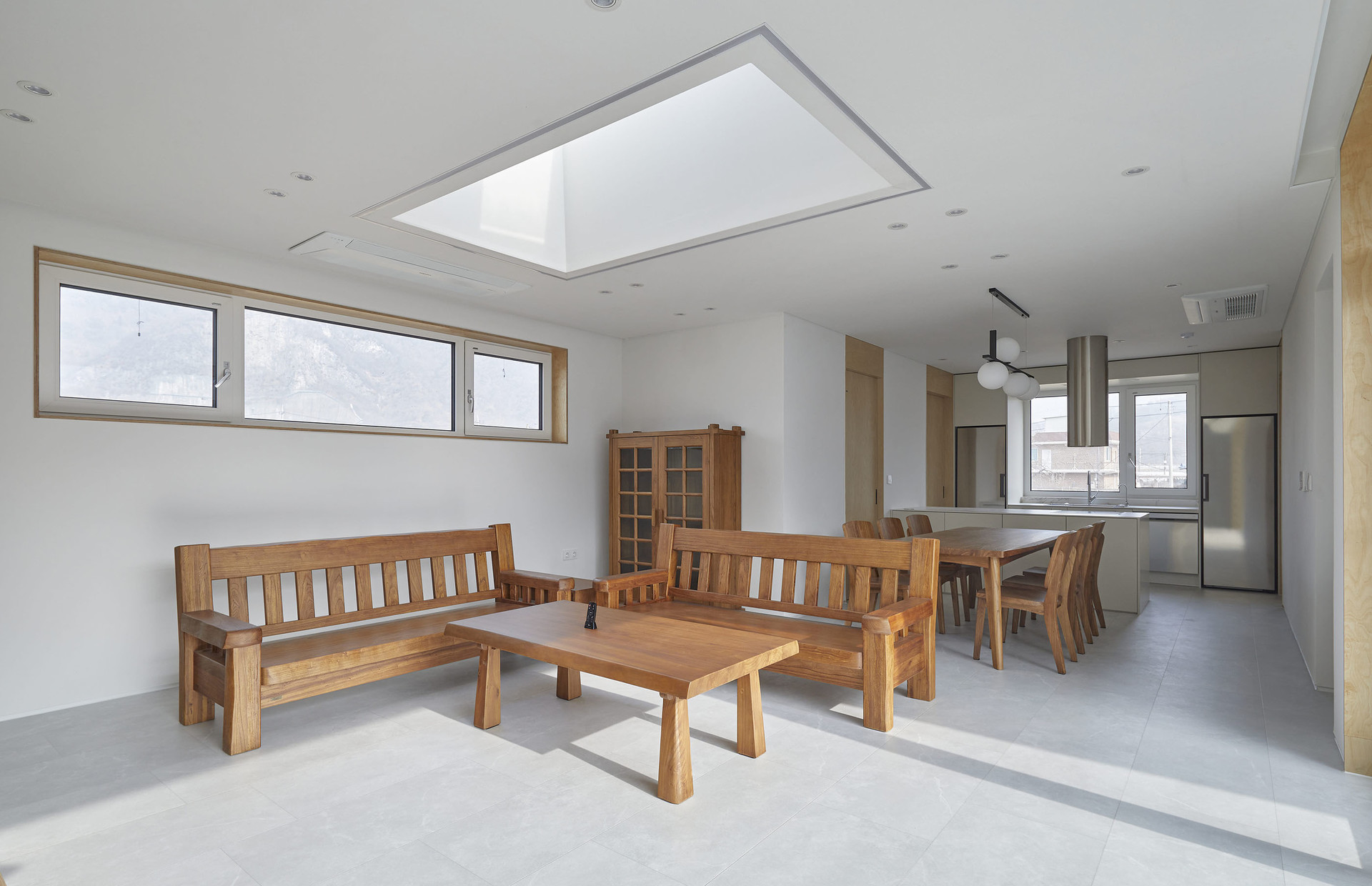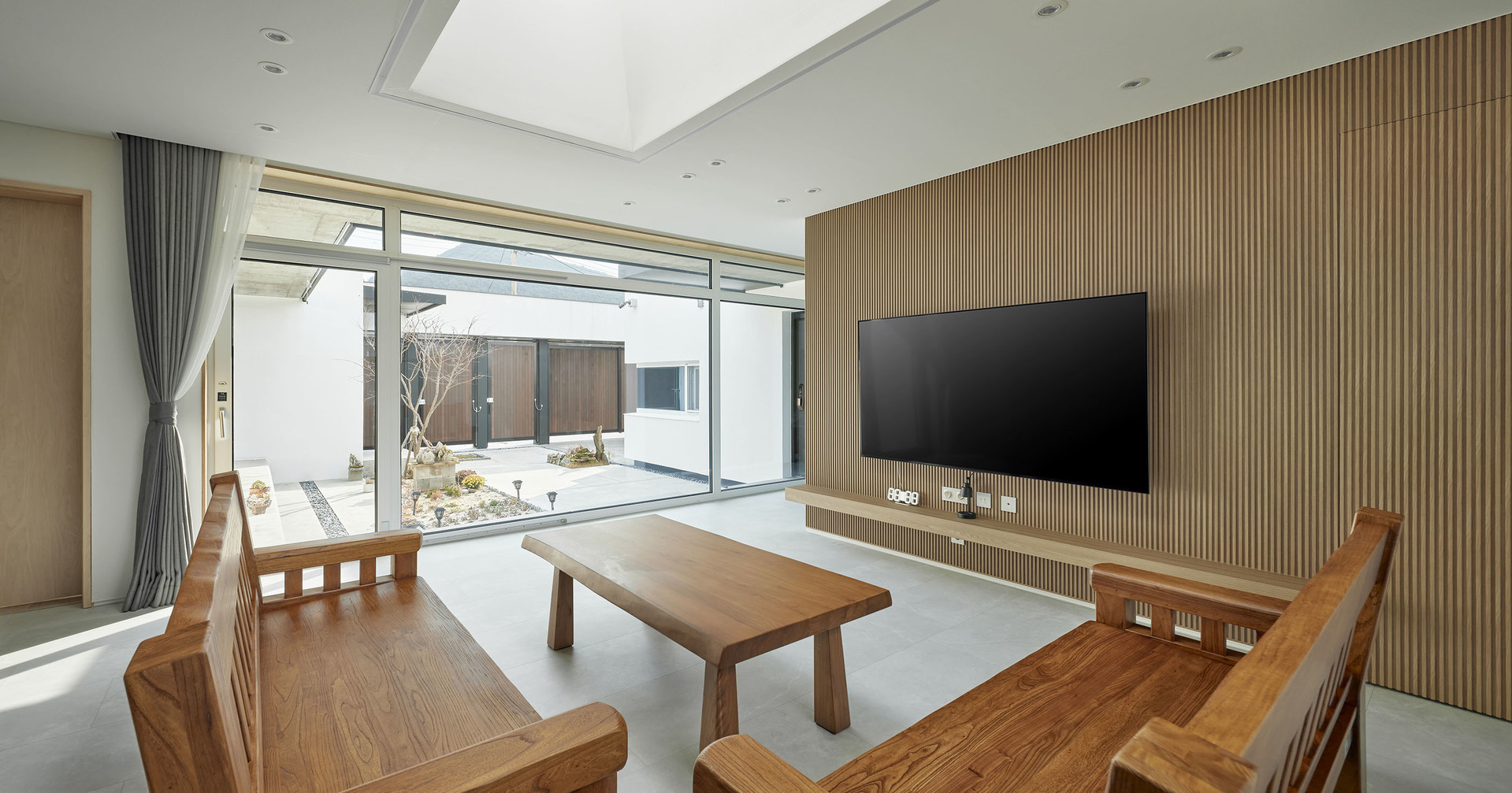 귀촌을 꿈꿨던 아들과 부모님이 함께 사는 강원도 영월의 단독주택입니다. 사방이 열린 대지 속에 담장과 높은 대문을 두어 외부로부터 가족들의 프라이버시를 보호하고, 아들과 부모님 두 개로 분리된 공간은 마당을 통해 연결되는 네모난 구조입니다. 외부로 열려 있지 않지만, 집 안의 마당과 각 거실의 천창은 하늘을 집 안으로 들여 개방감을 주고, 햇살과 자연이 집 안으로 충분히 들어올 수 있도록 설계했습니다.