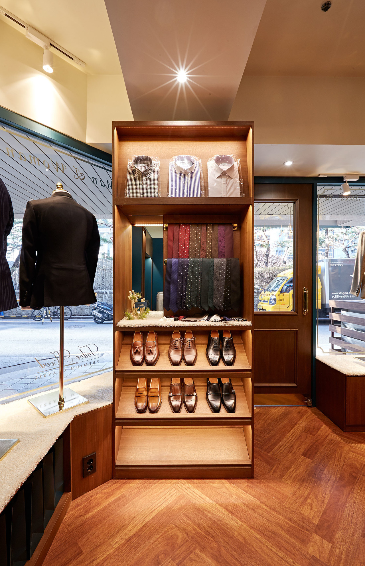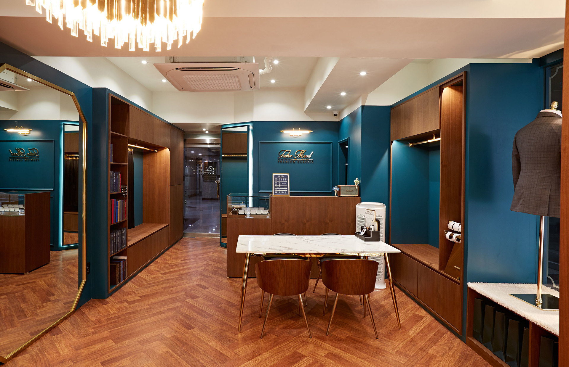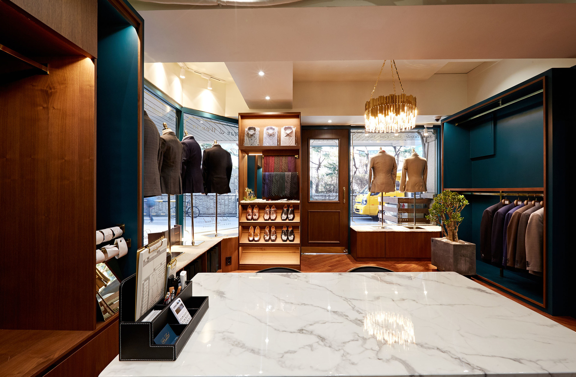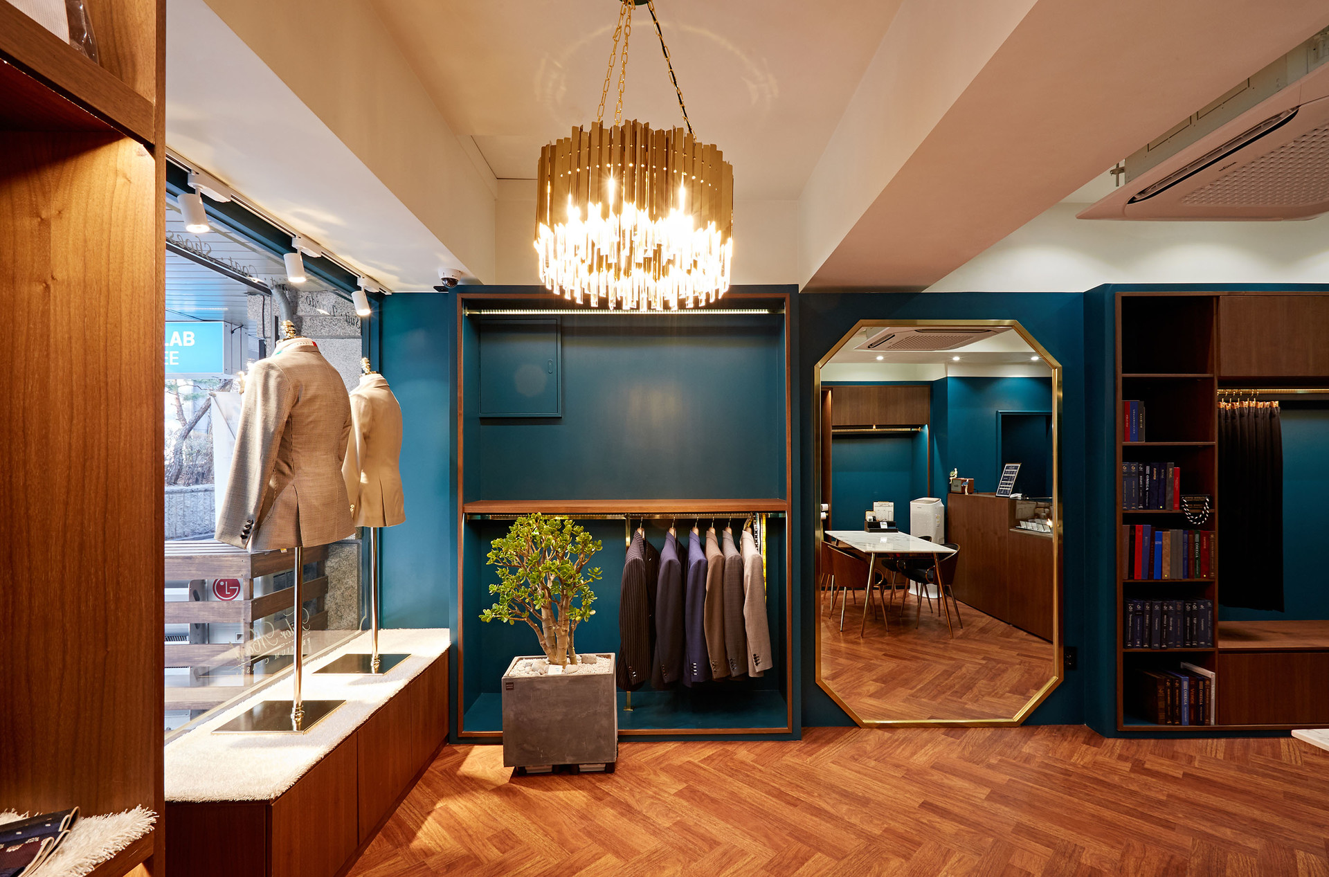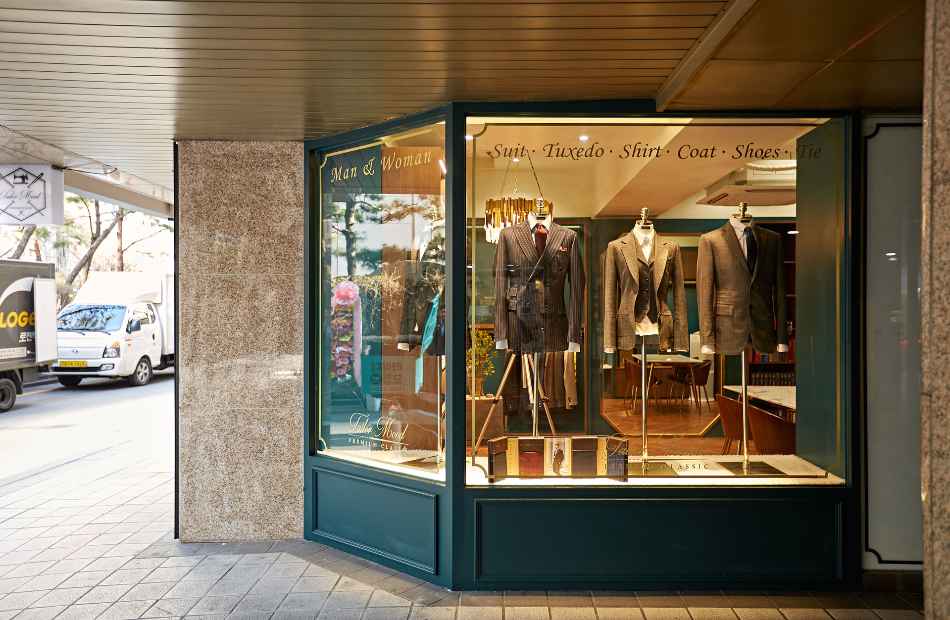 청녹색 벽체와 천장을 바탕으로, 월넛 톤 가구와 골드 포인트를 더해 클래식하고 품격 있는 테일러샵 무드를 연출했습니다.
