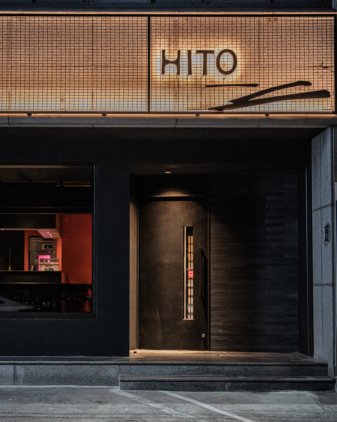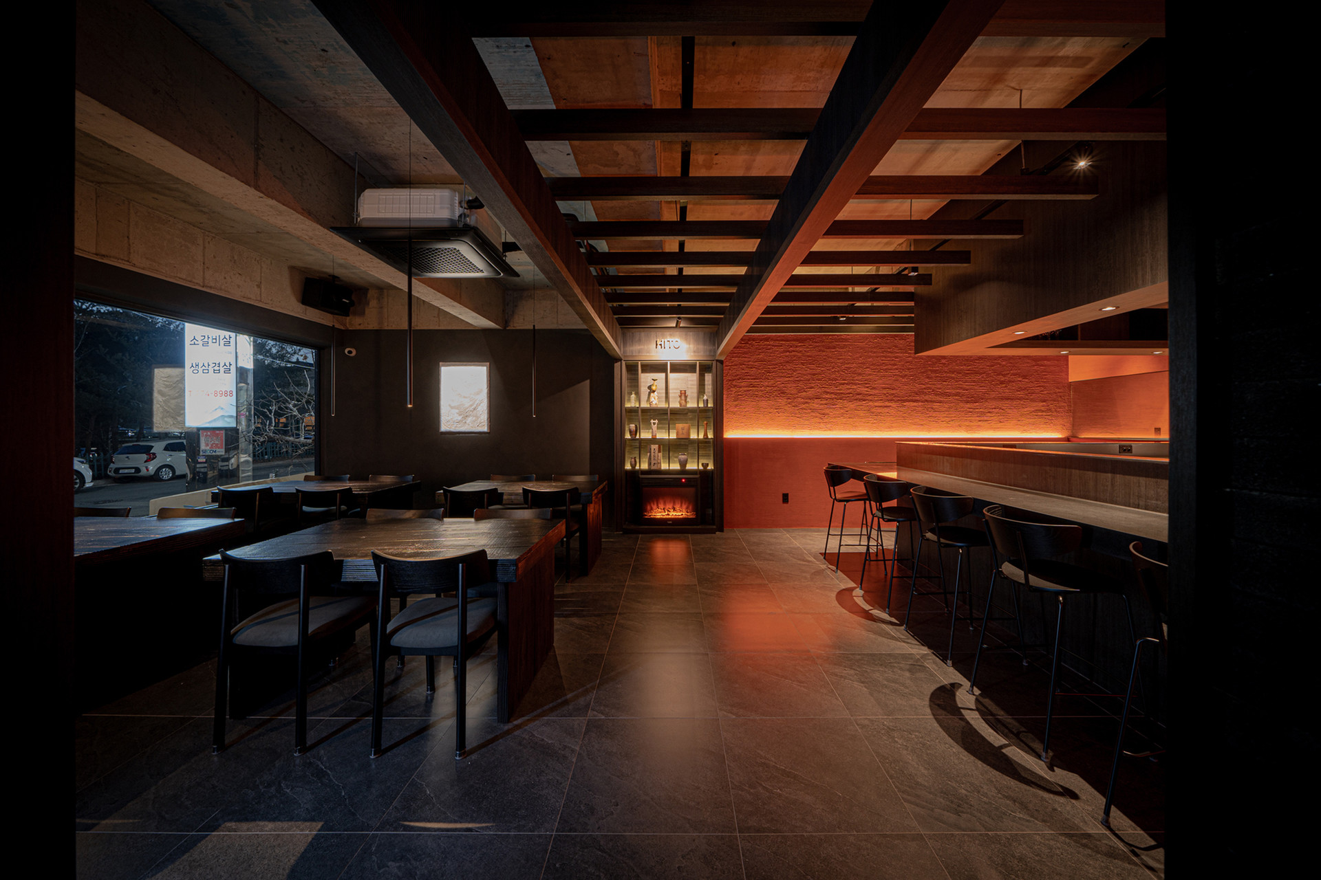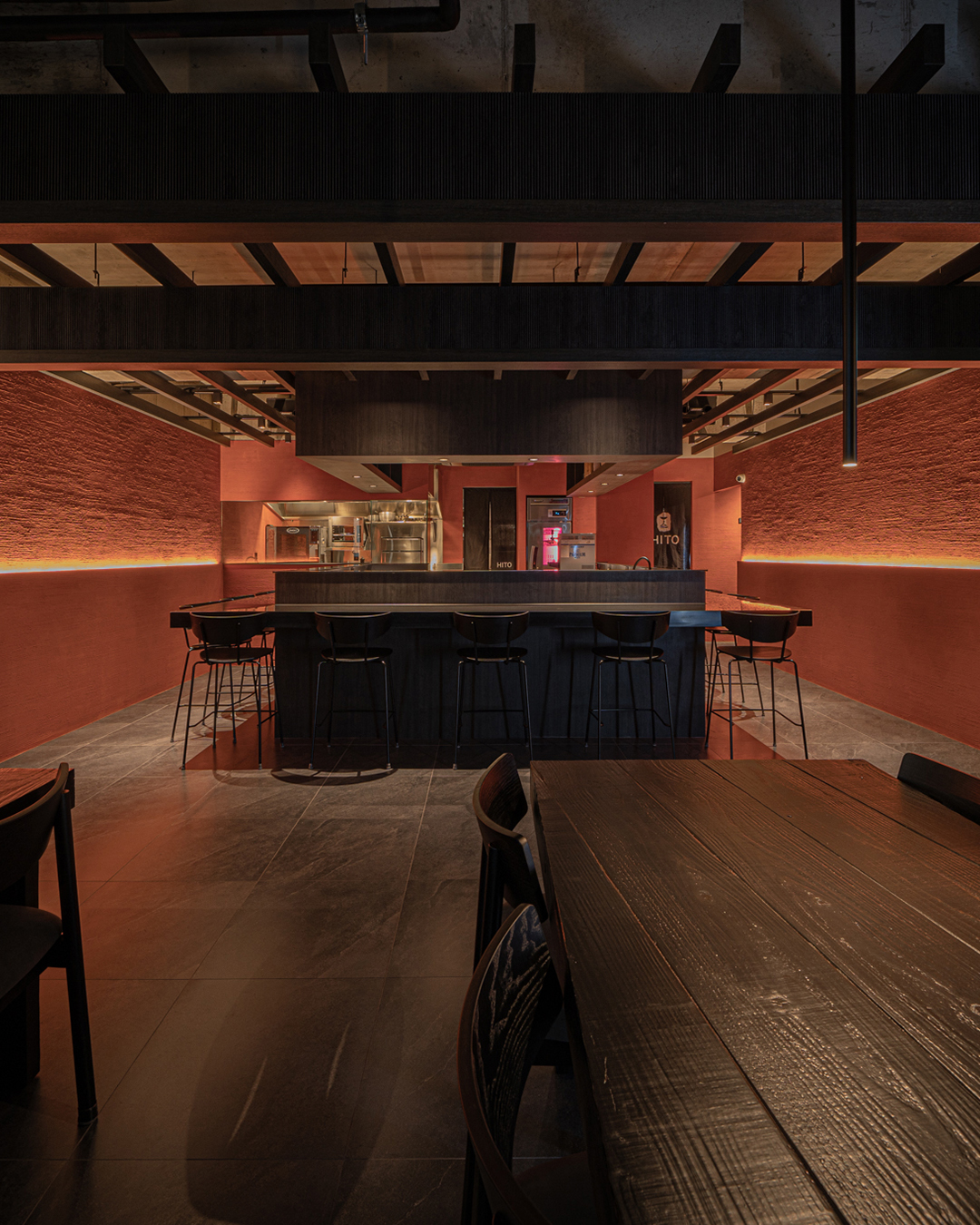 불(火)과 흙(土)의 의미를 공간 재료에 적용해 노출 콘크리트 천장과 벽돌 타일, 붉은 라사토를 활용하여 강렬하면서도 따뜻한 공간으로 디자인했습니다. 스톤 미장을 통해 지층을 연상시키고, 탄화목 테이블의 매스감을 더해 깊이감 있는 공간으로 완성하고자 하였습니다. 또한 히토의 불과 흙이라는 의미에 더해, 연달아 읽으면 ‘사람’이라는 뜻이 되는 점을 그래픽 모티프로 삼아 브랜딩을 전개하고 공간에 적용하였습니다.