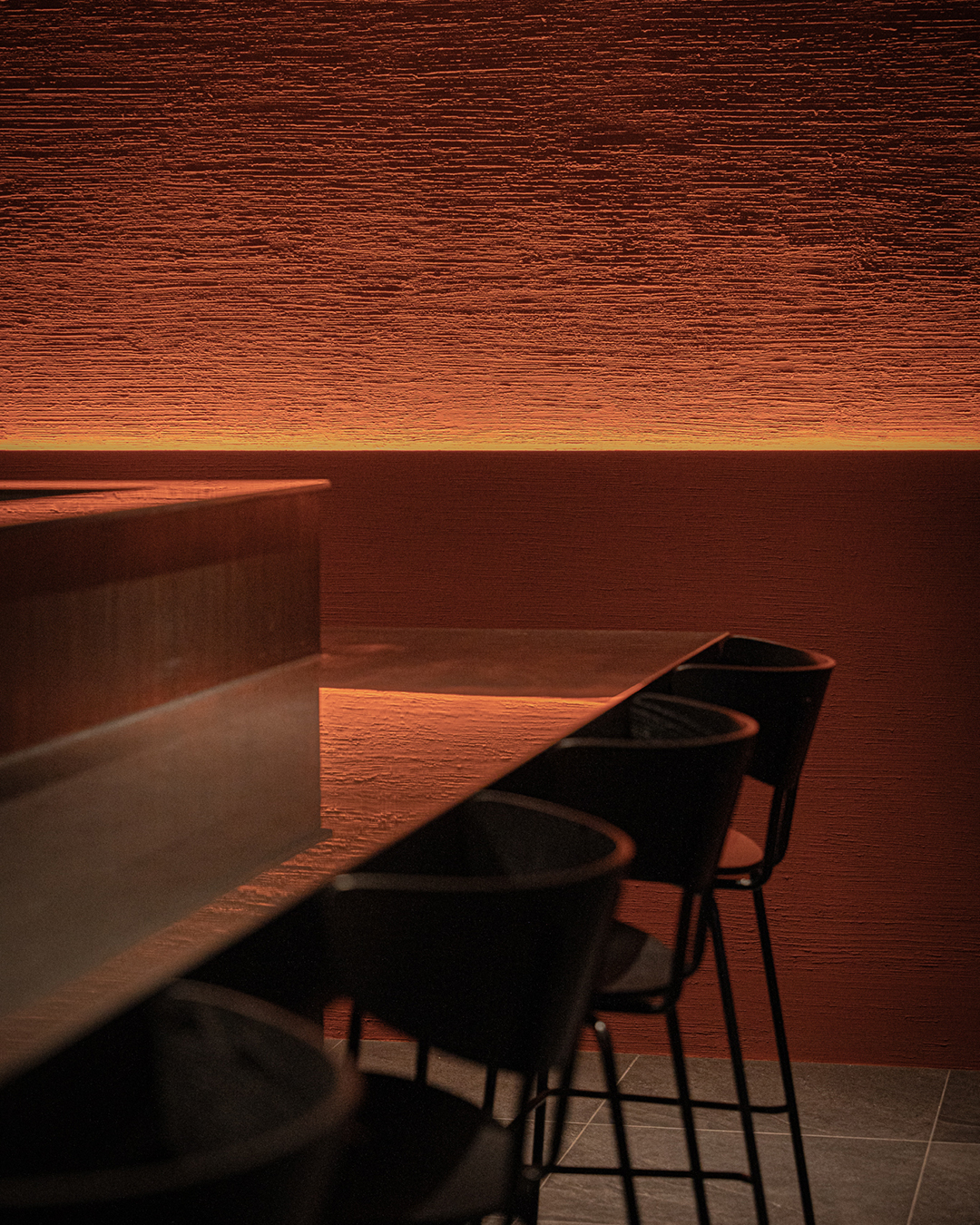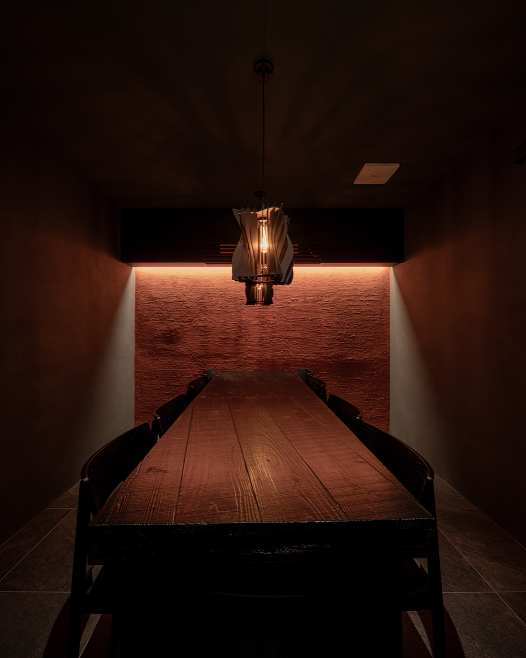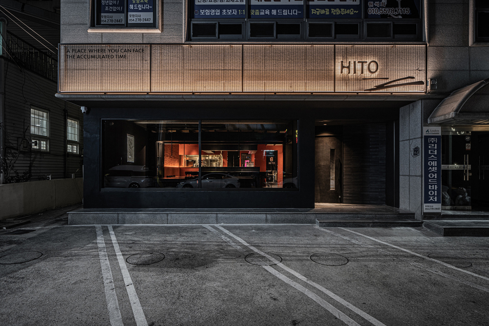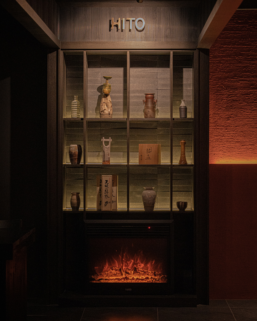 불(火)과 흙(土)의 의미를 공간 재료에 적용해 노출 콘크리트 천장과 벽돌 타일, 붉은 라사토를 활용하여 강렬하면서도 따뜻한 공간으로 디자인했습니다. 스톤 미장을 통해 지층을 연상시키고, 탄화목 테이블의 매스감을 더해 깊이감 있는 공간으로 완성하고자 하였습니다. 또한 히토의 불과 흙이라는 의미에 더해, 연달아 읽으면 ‘사람’이라는 뜻이 되는 점을 그래픽 모티프로 삼아 브랜딩을 전개하고 공간에 적용하였습니다.