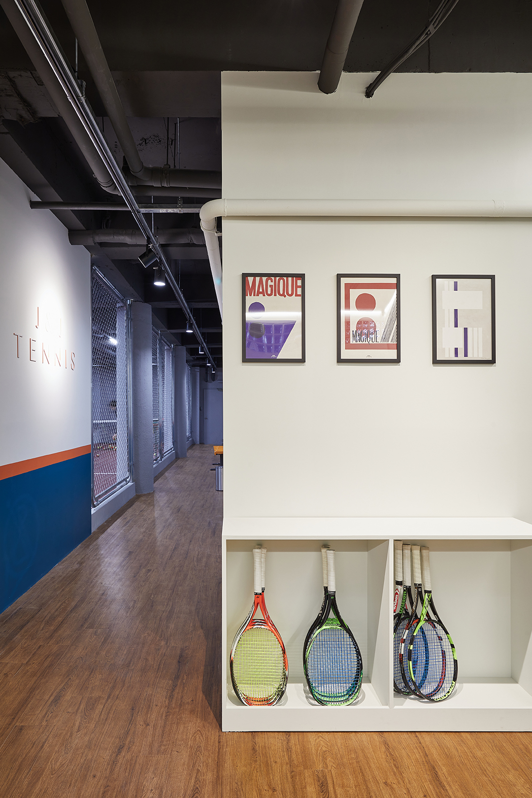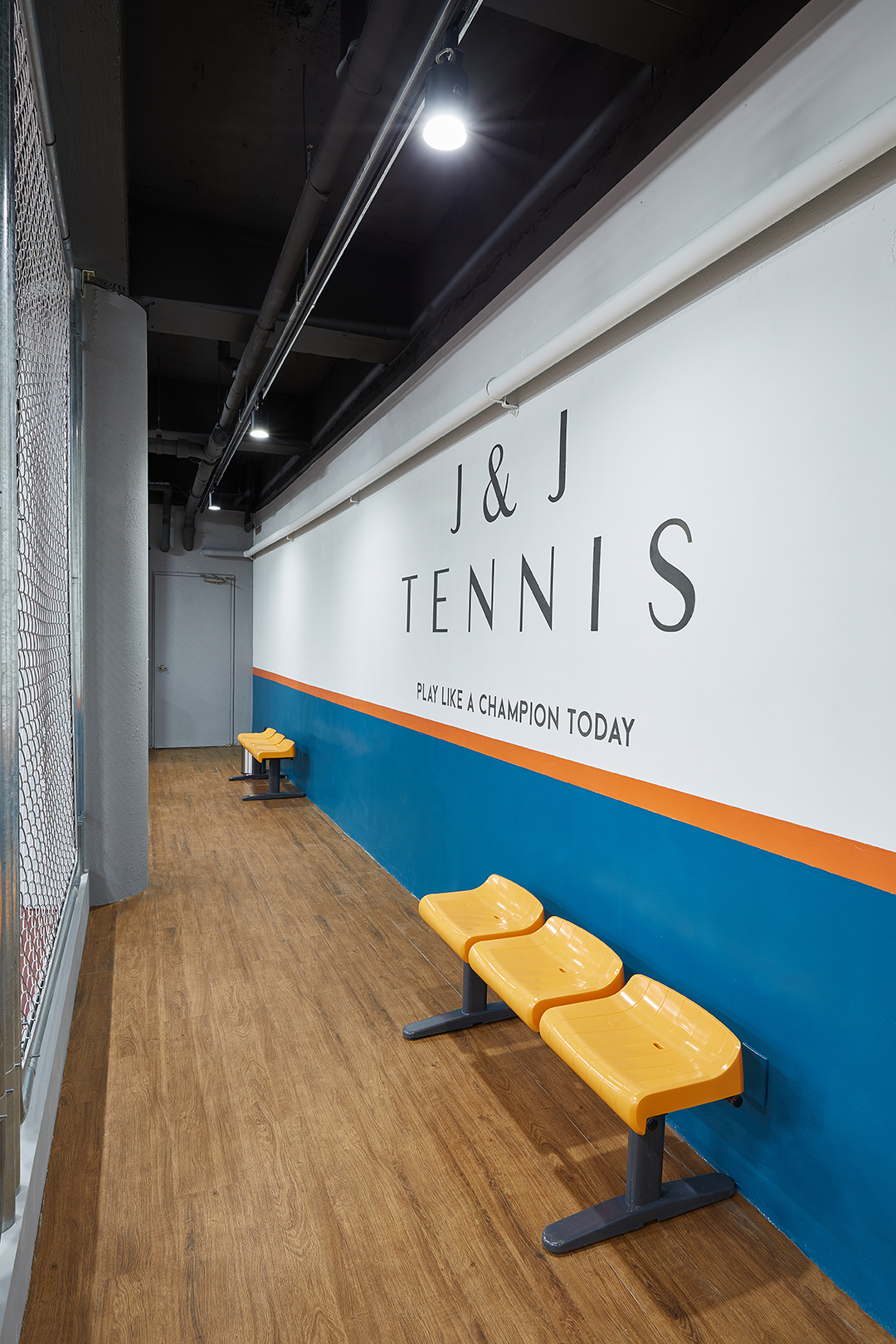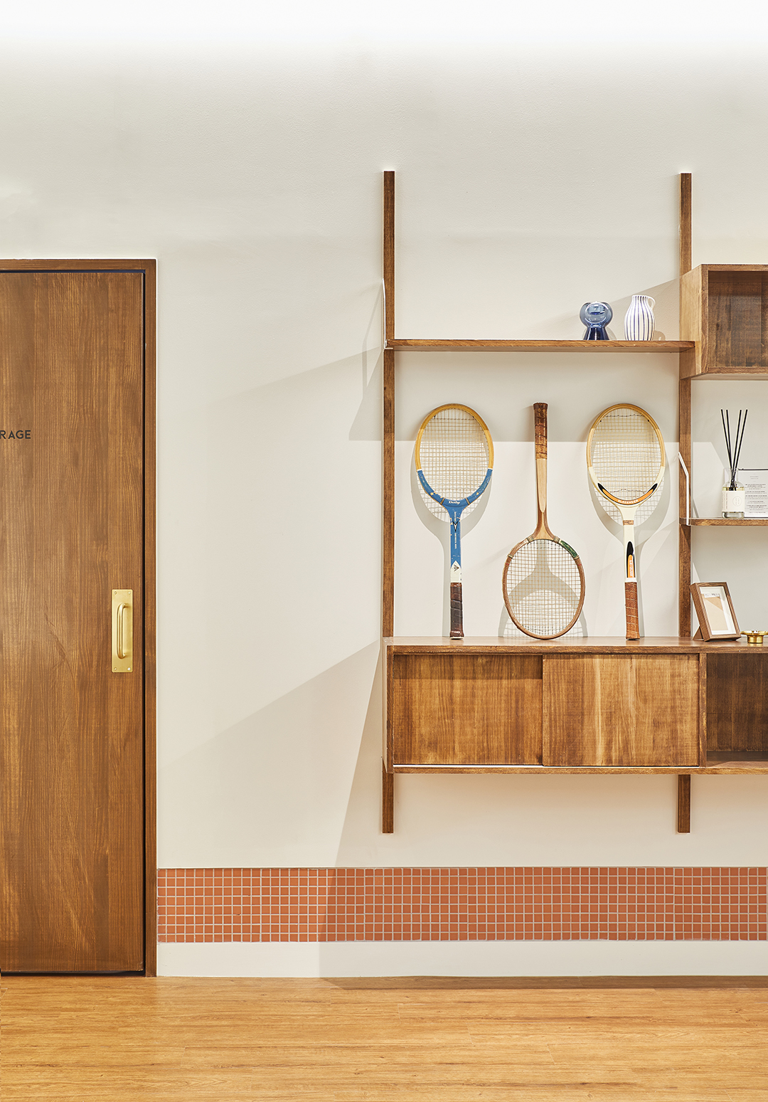 J&J TENNIS의 첫 매장입니다. 반포 주택가에 위치한 건물 내 지하 공간으로 내려오는 입구의 구조가 숨겨져 있듯 존재하여, 진입 동선 설계에 많은 고민이 필요했습니다. 자칫 치명적일 수 있는 이 점을 오히려 아지트 같아 좋다며 긍정적으로 여기시는 클라이언트의 모습을 보고 힌트를 얻어, 도심 내 숨겨진 소박하고 오래된 테니스장의 무드를 연출하기 위해 미드 센추리 모던 컨셉을 크롬 소재 없이 우드 소재를 위주로 사용하고, 빈티지한 컬러를 활용한 마감 방식을 통해 마치 예전부터 존재해왔던 공간처럼 보이고자 하였습니다.