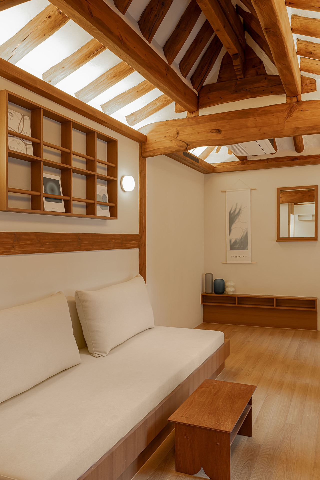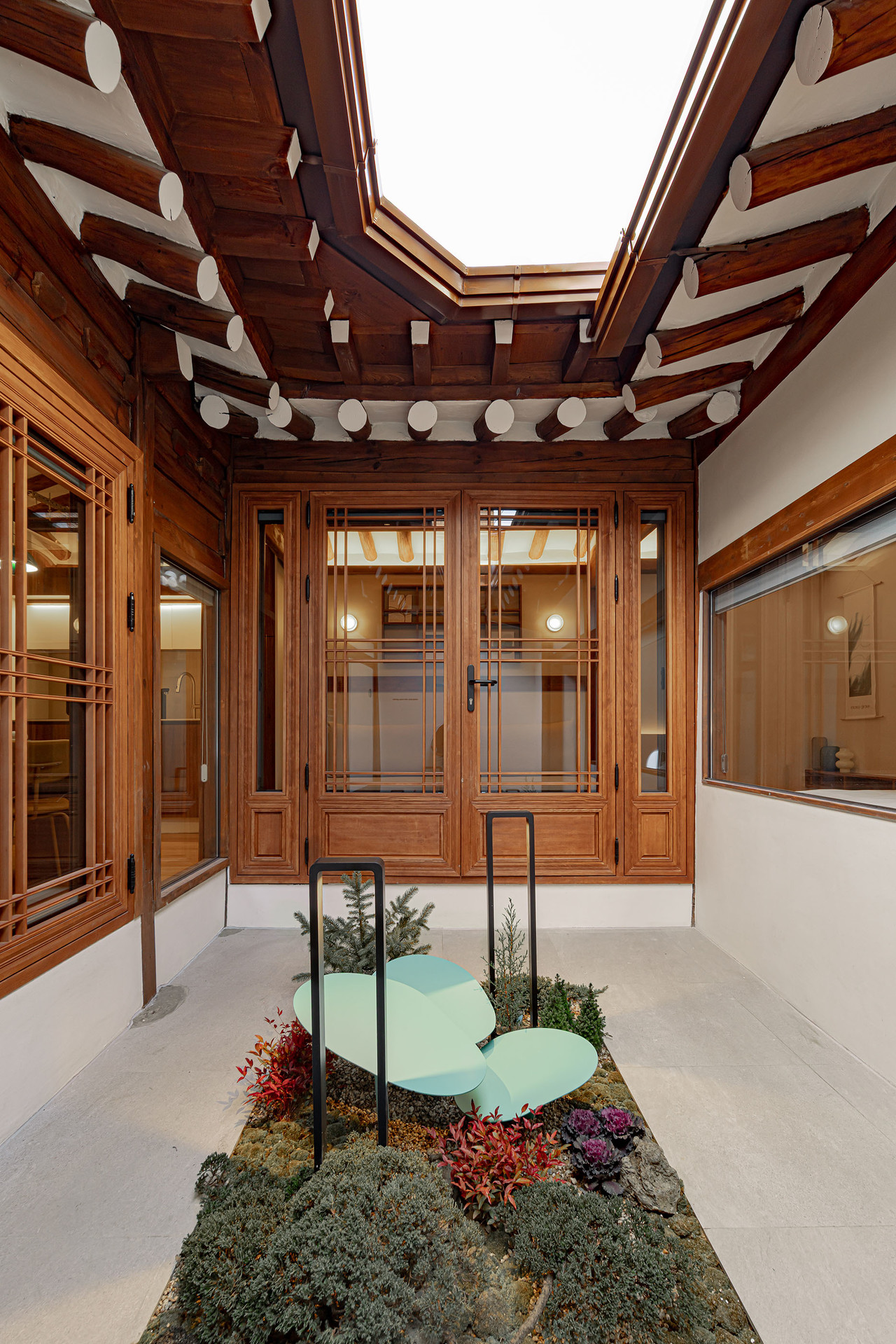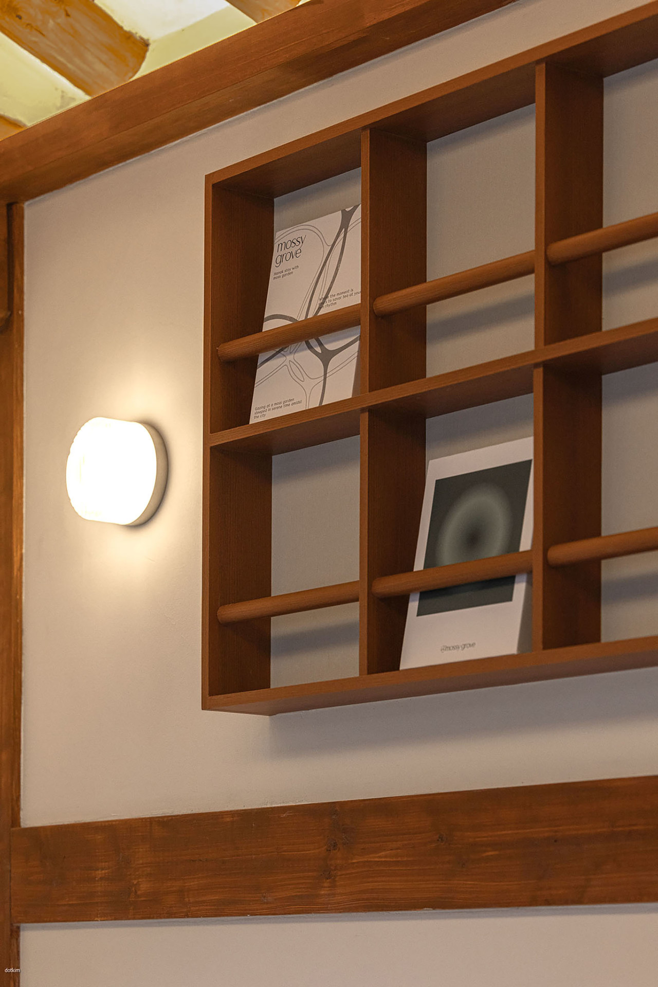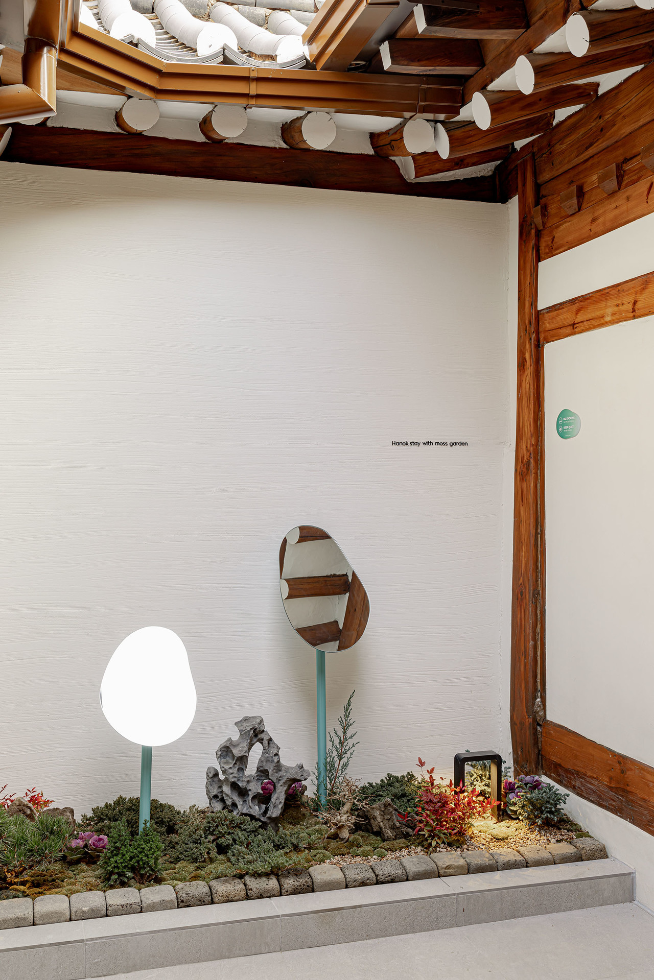 컨셉에 맞춰 ‘ㅁ’자 중정형 한옥 구조에 이끼 정원을 조성하고, 공간 곳곳에 그린 계열의 금속 가구를 배치하여 전형적인 한옥에서 한 걸음 더 나아간 색다른 경험을 담은 공간으로 설계하였습니다. ‘나만의 향과 시간을 머금는 공간’이라는 개념을 바탕으로 이끼의 유기적인 형태와 이끼와 차가 머금고 있는 수분의 이미지를 시각화한 브랜딩 요소들을 공간 전반에 적용하였습니다.