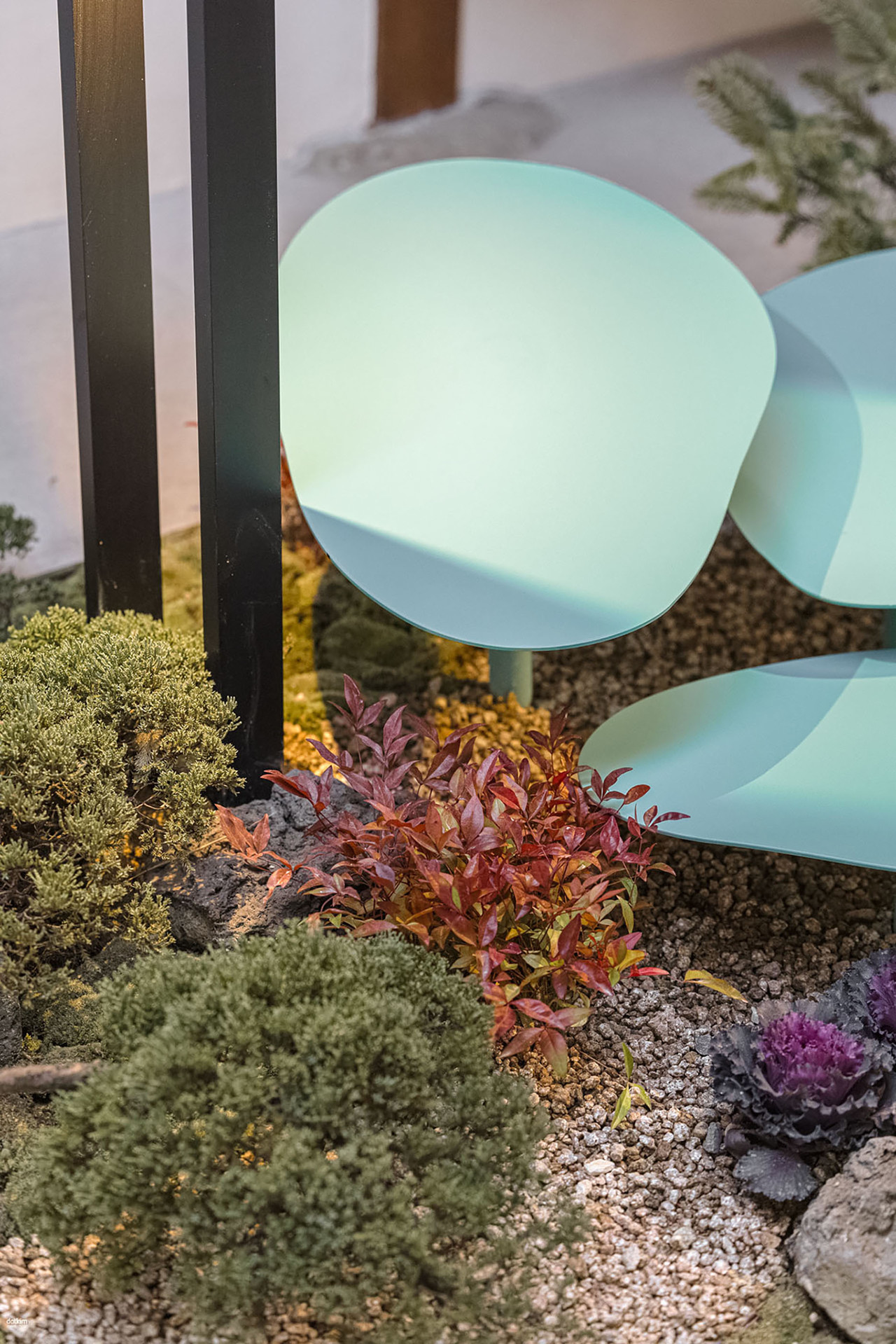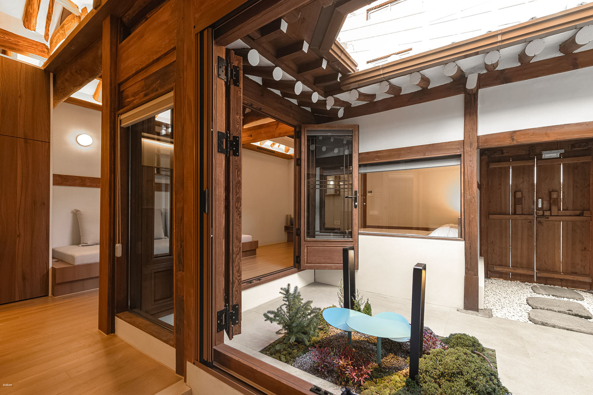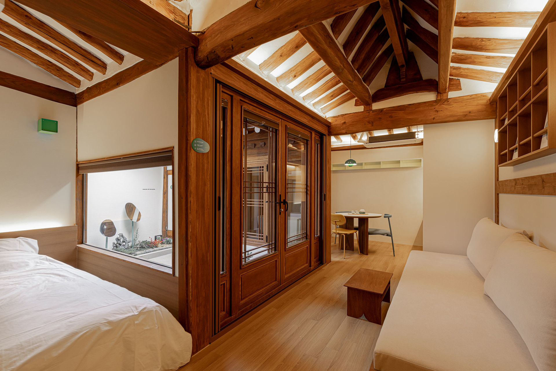컨셉에 맞춰 ‘ㅁ’자 중정형 한옥 구조에 이끼 정원을 조성하고, 공간 곳곳에 그린 계열의 금속 가구를 배치하여 전형적인 한옥에서 한 걸음 더 나아간 색다른 경험을 담은 공간으로 설계하였습니다. ‘나만의 향과 시간을 머금는 공간’이라는 개념을 바탕으로 이끼의 유기적인 형태와 이끼와 차가 머금고 있는 수분의 이미지를 시각화한 브랜딩 요소들을 공간 전반에 적용하였습니다.