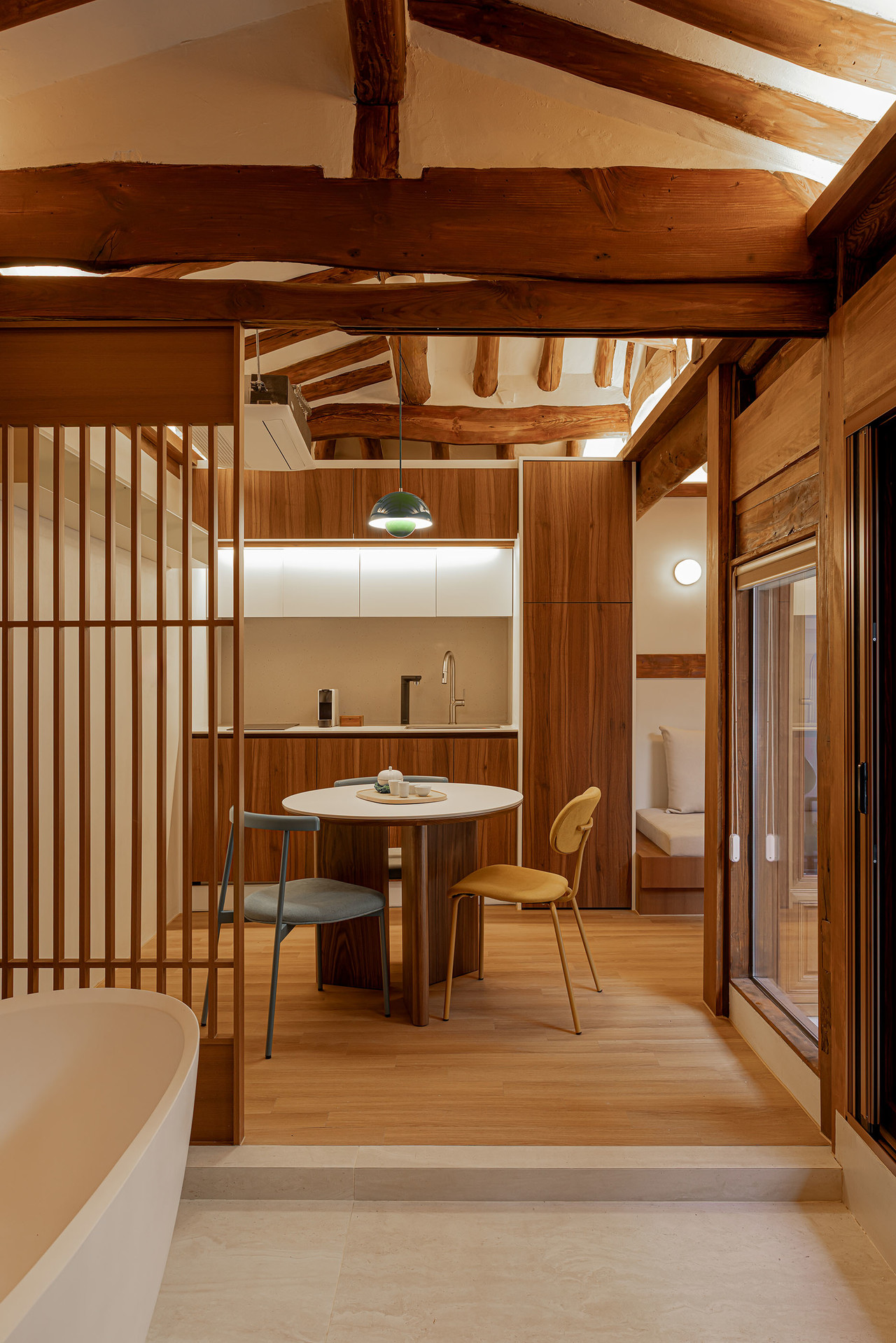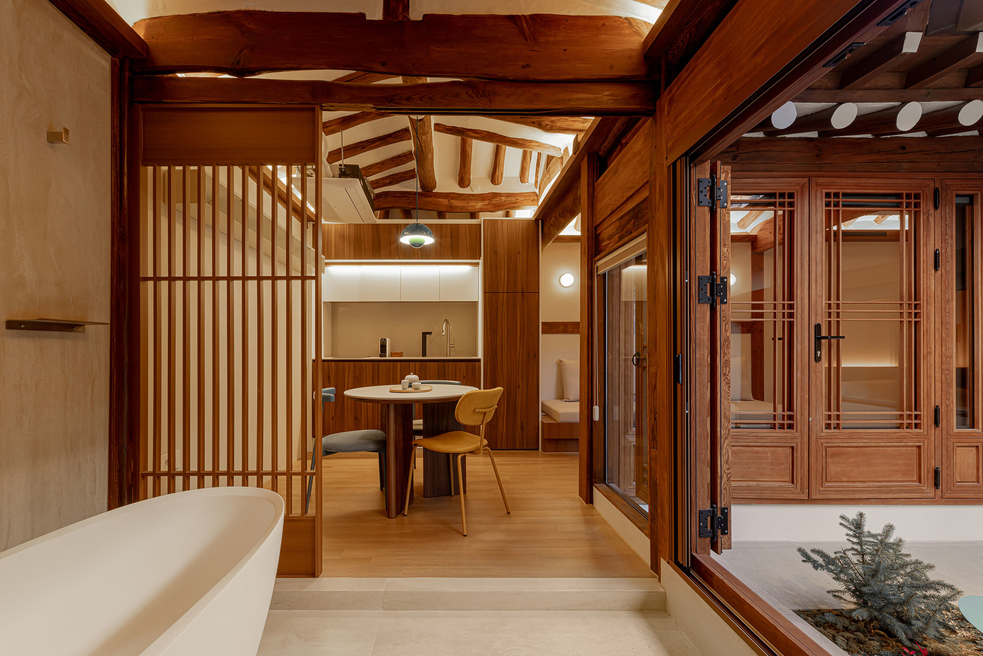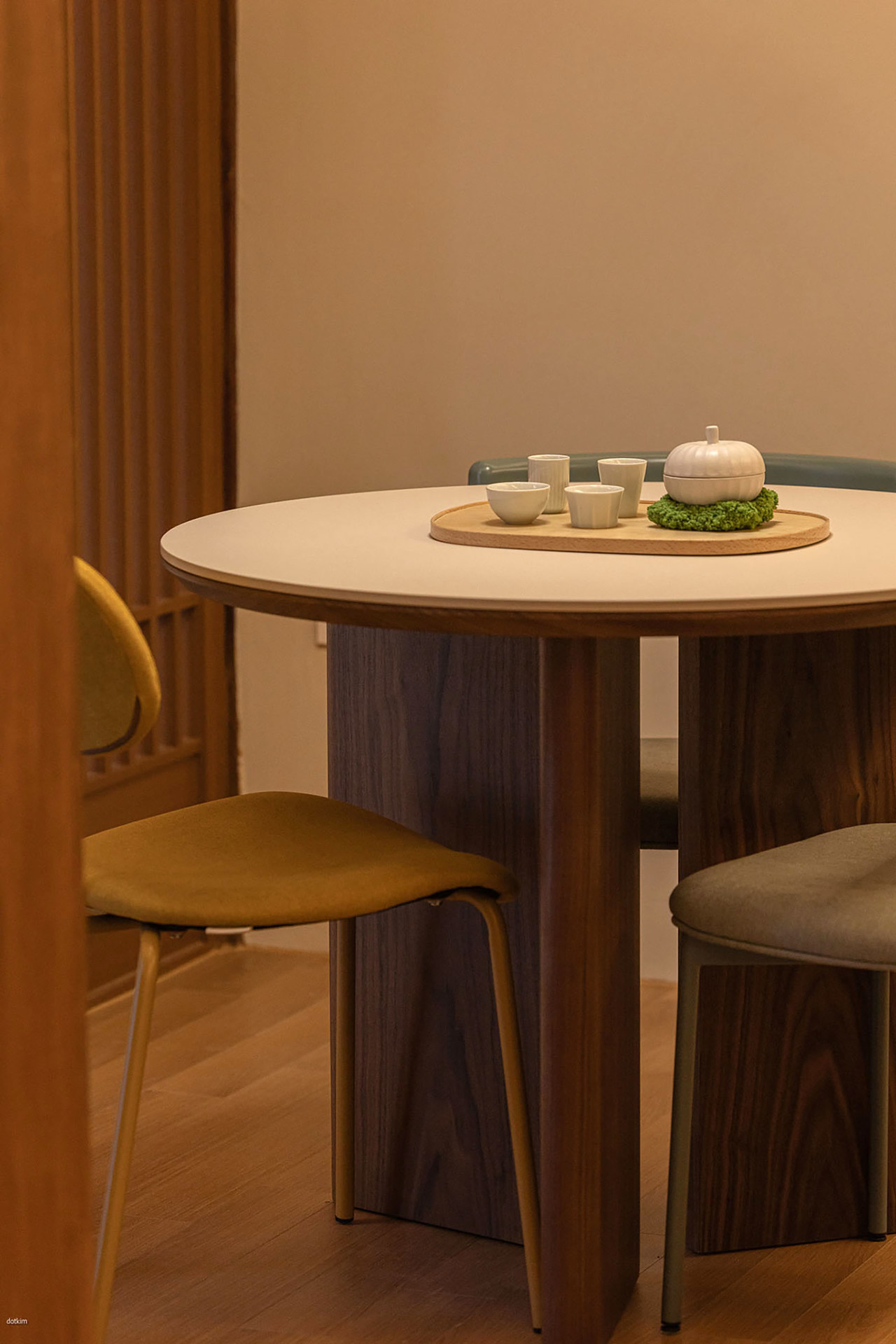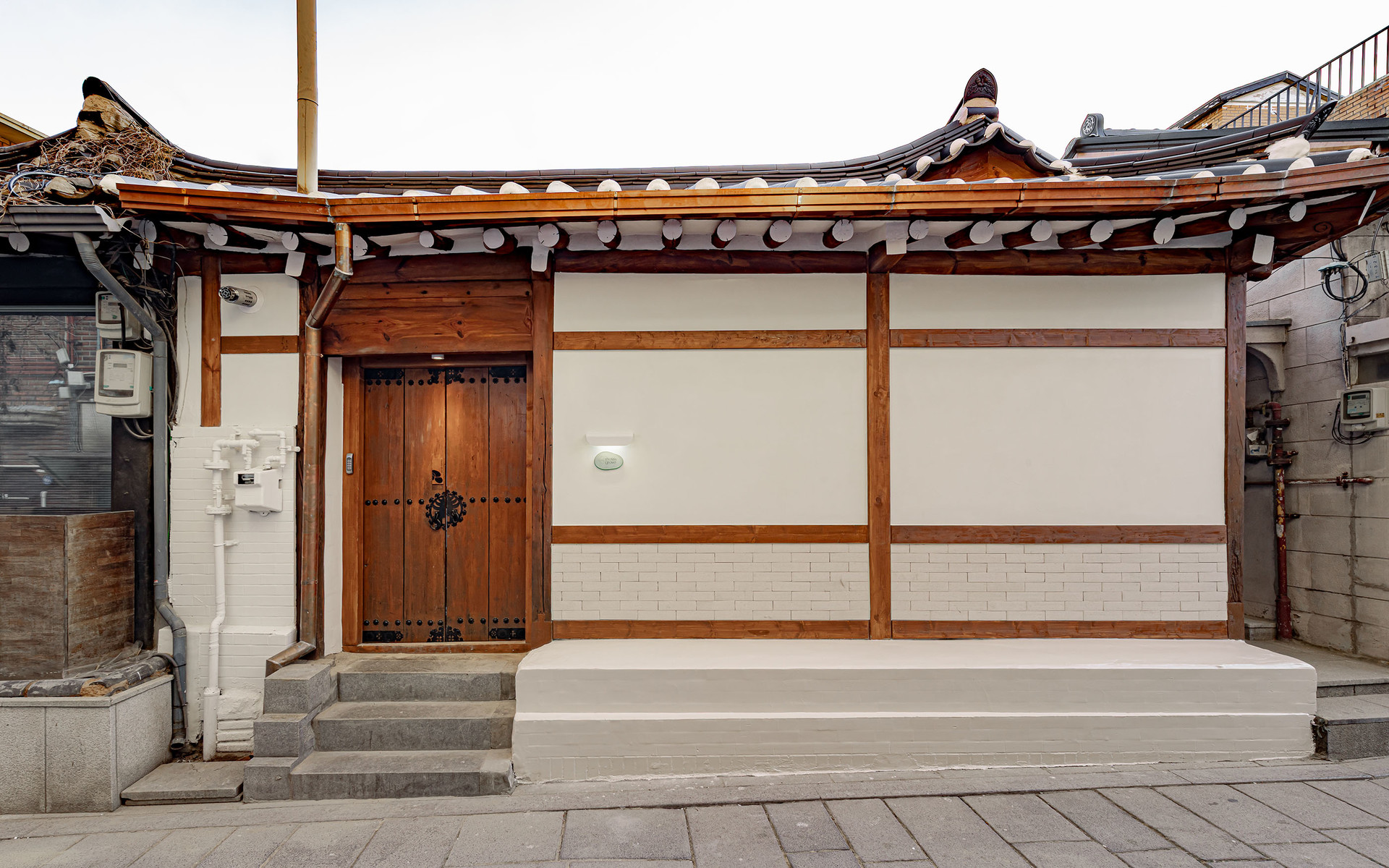 컨셉에 맞춰 ‘ㅁ’자 중정형 한옥 구조에 이끼 정원을 조성하고, 공간 곳곳에 그린 계열의 금속 가구를 배치하여 전형적인 한옥에서 한 걸음 더 나아간 색다른 경험을 담은 공간으로 설계하였습니다. ‘나만의 향과 시간을 머금는 공간’이라는 개념을 바탕으로 이끼의 유기적인 형태와 이끼와 차가 머금고 있는 수분의 이미지를 시각화한 브랜딩 요소들을 공간 전반에 적용하였습니다.