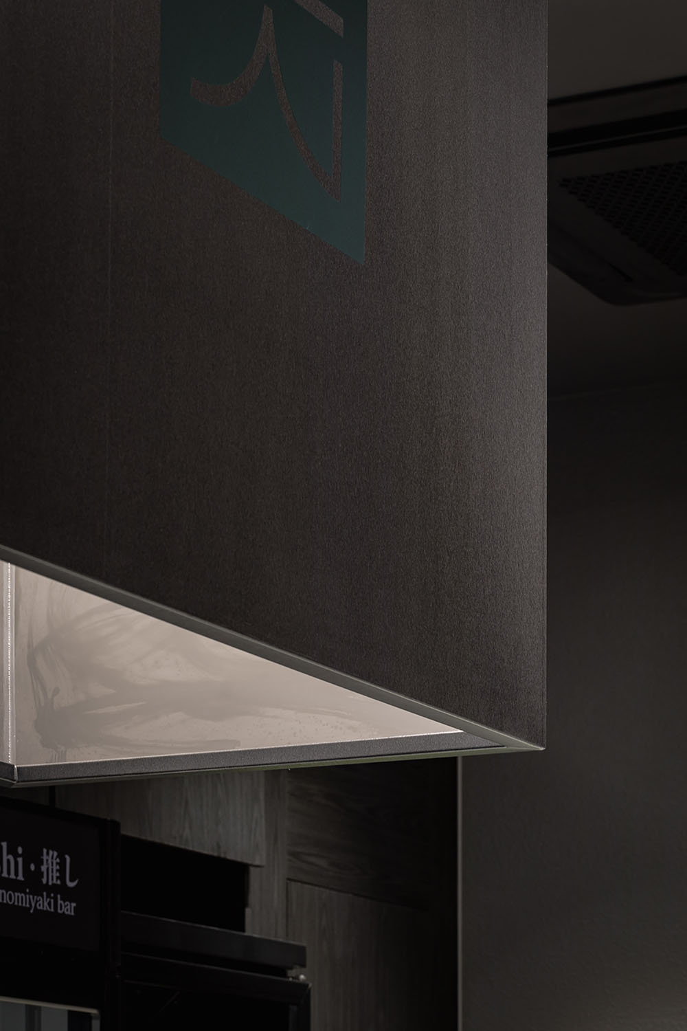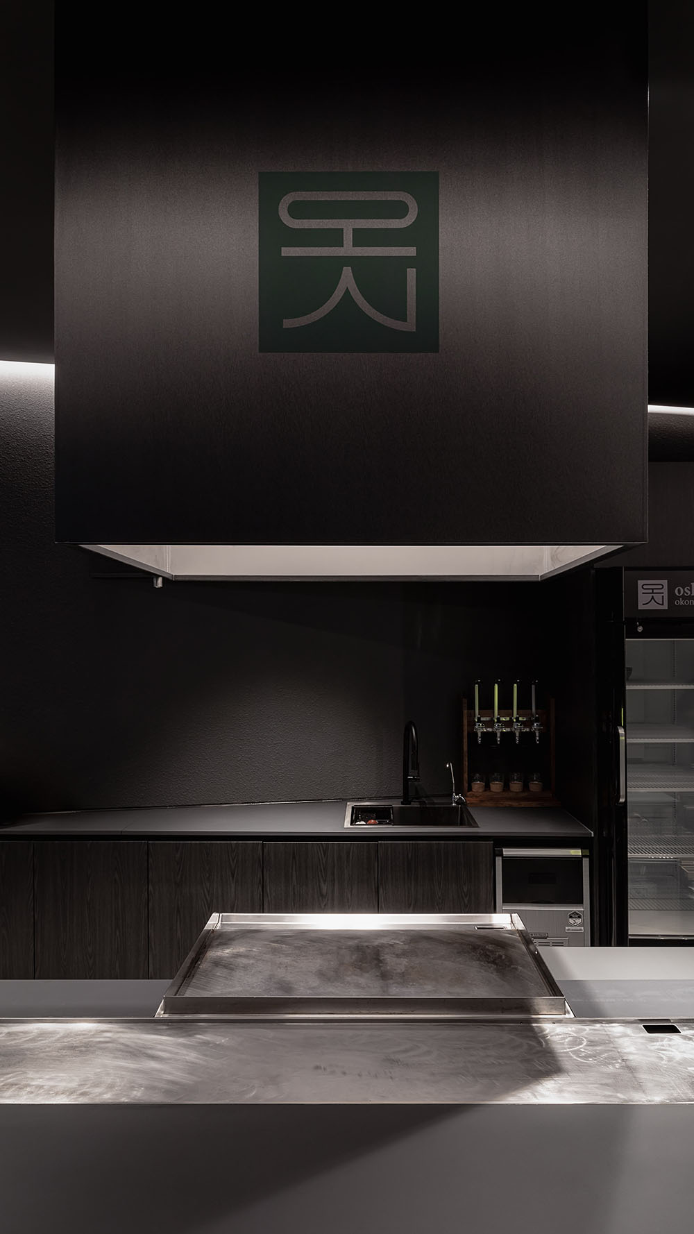 일식 브랜드이지만 전통적인 우드 톤의 디자인과는 다른 차별성을 가지고, 사선으로 배치된 바 테이블과 벽에서 천장까지 이어진 라인 조명으로 긴 공간의 장점을 잘 보여주는 공간입니다. 협소한 공간이지만 미니멀하면서도 모던한 포인트로 공간의 특수성을 살린 설계였습니다.