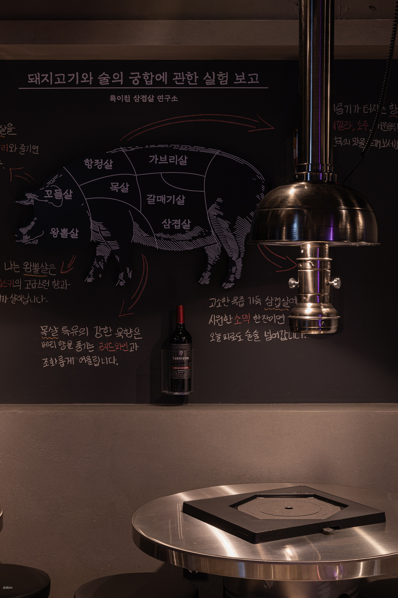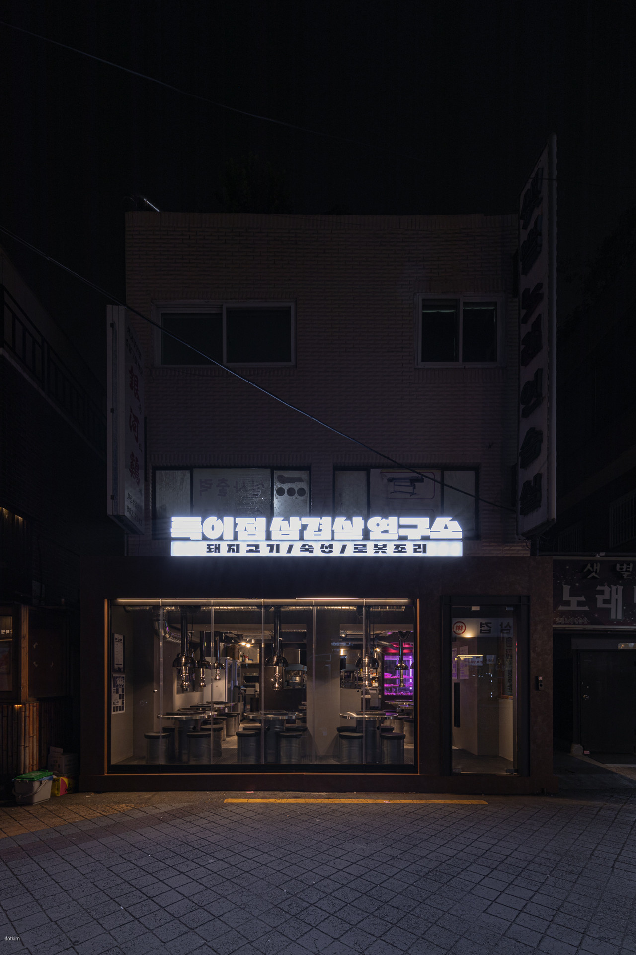 특이점 삼겹살 연구소는 맛있는 고기를 위해 로봇까지 개발한 브랜드입니다. 레트로하고 따뜻한 연출에 부식동 마감재를 활용하여 친숙하고, 연구의 고심이 느껴지는 공간으로 설계했습니다.
